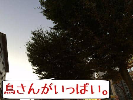 街路樹の中で…大勢の鳥さんが大合唱中。。