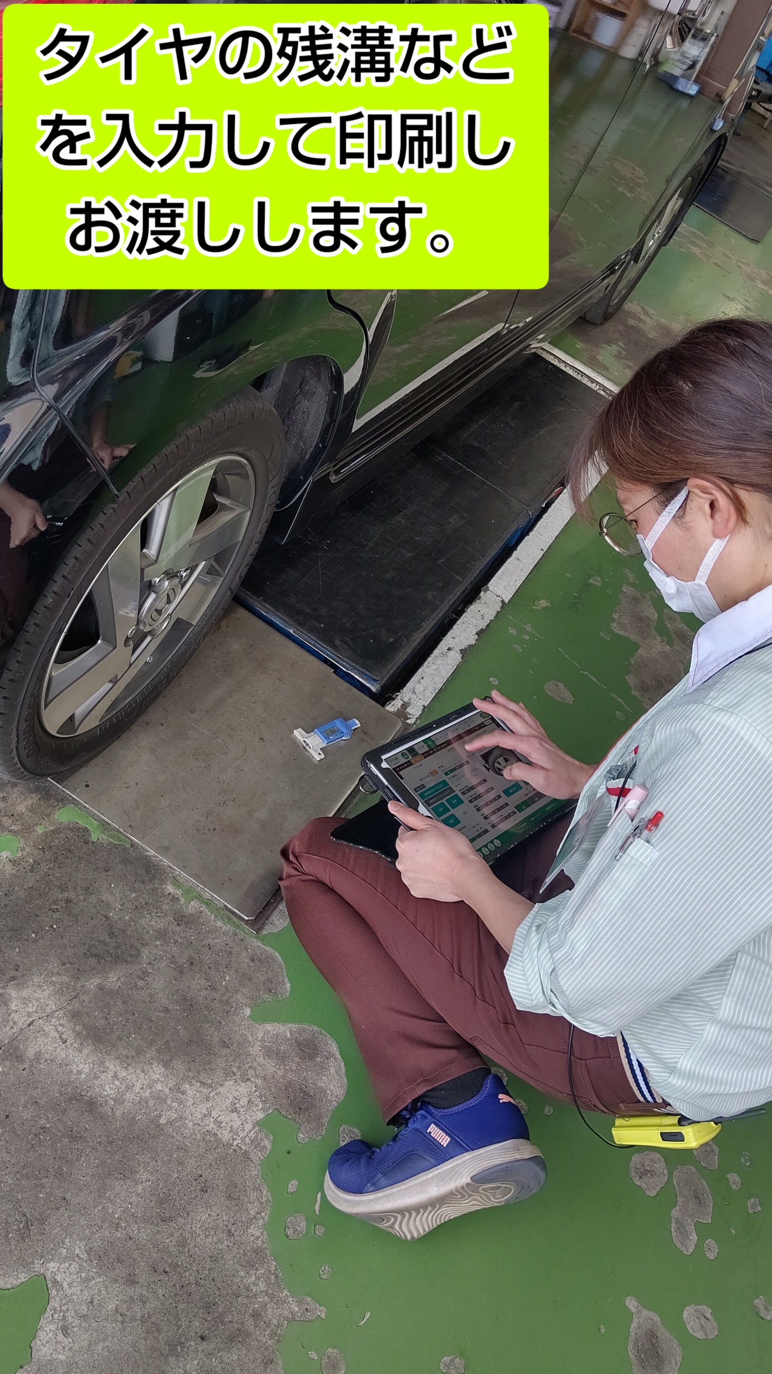 1本づつタイヤの溝を測定し、外傷やヒビの有無、タイヤが変な減り方をしてないか入力して印刷しお渡しいたします。