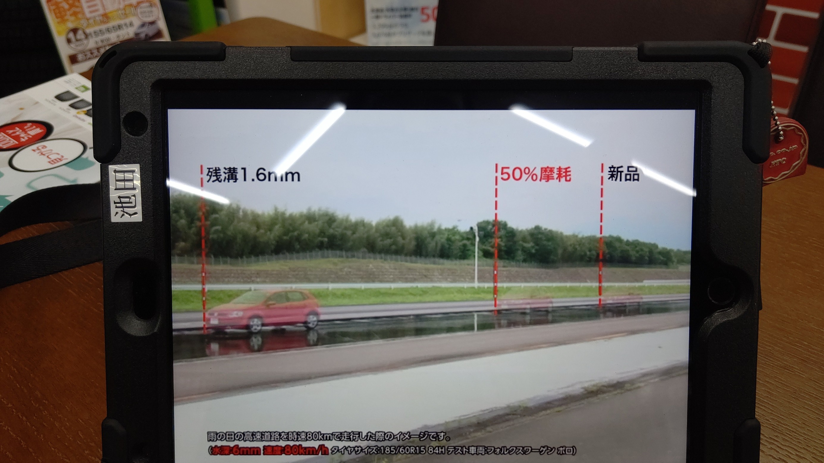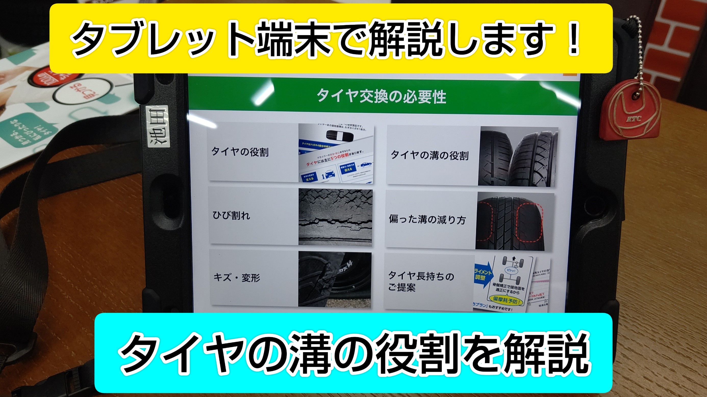 タイヤ館岩国では、なぜタイヤ交換が必要になるのかをタブレット端末で解説もできます。