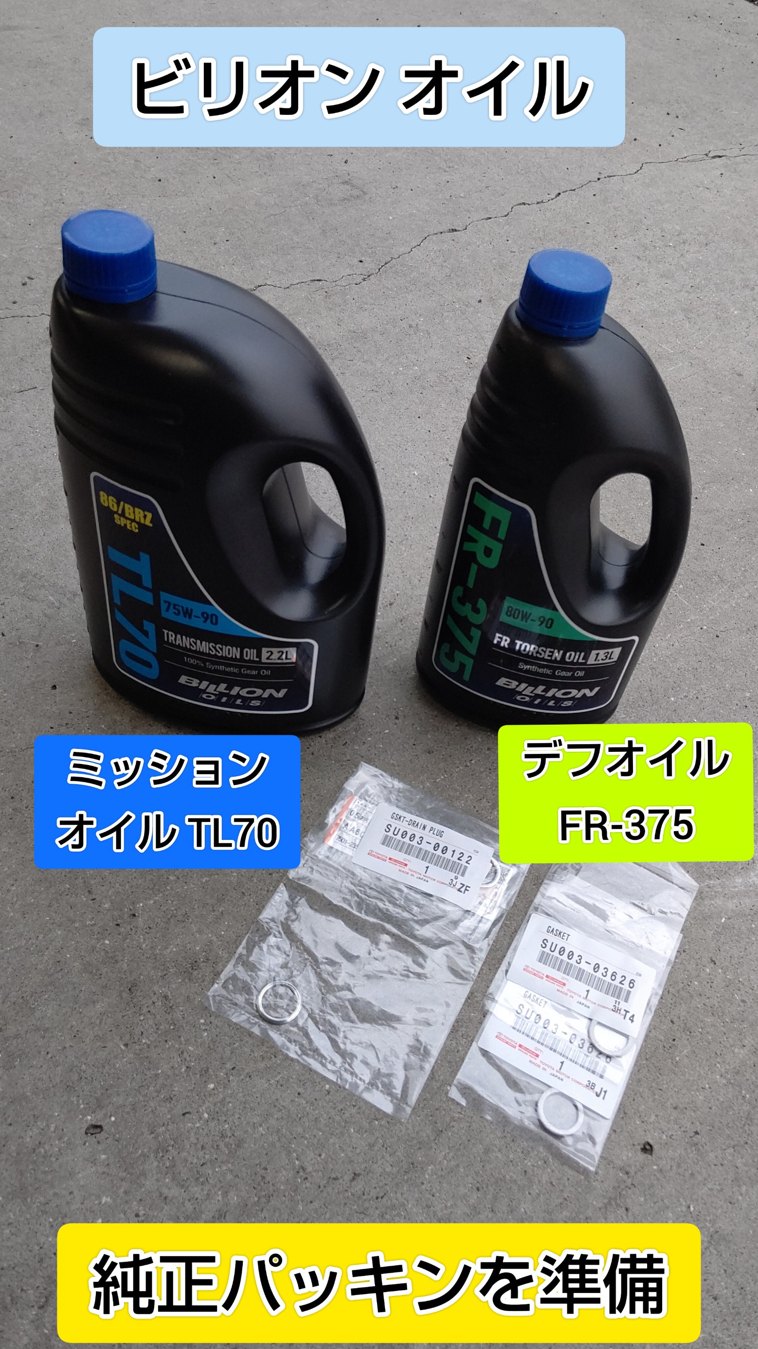 ビリオンで86/BRZとGR86/BRZ専用のTL70とFR-375になります。どちらも使いきりのオイル量になってるのがオススメポイントです。