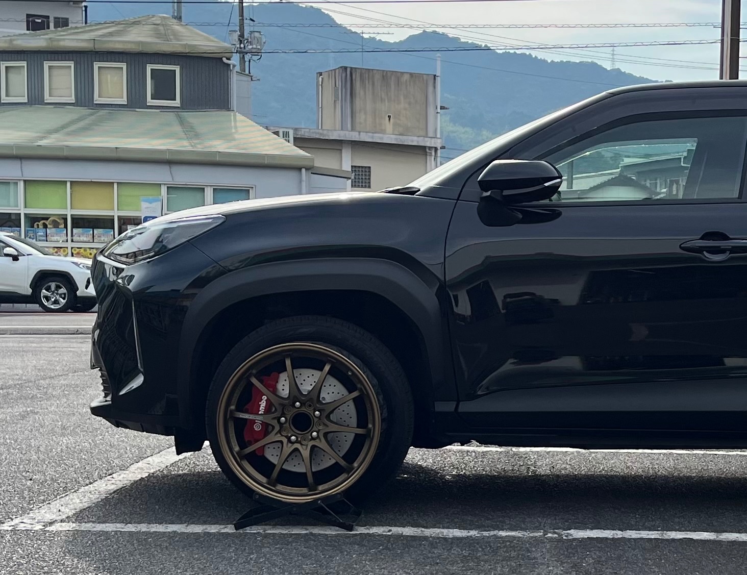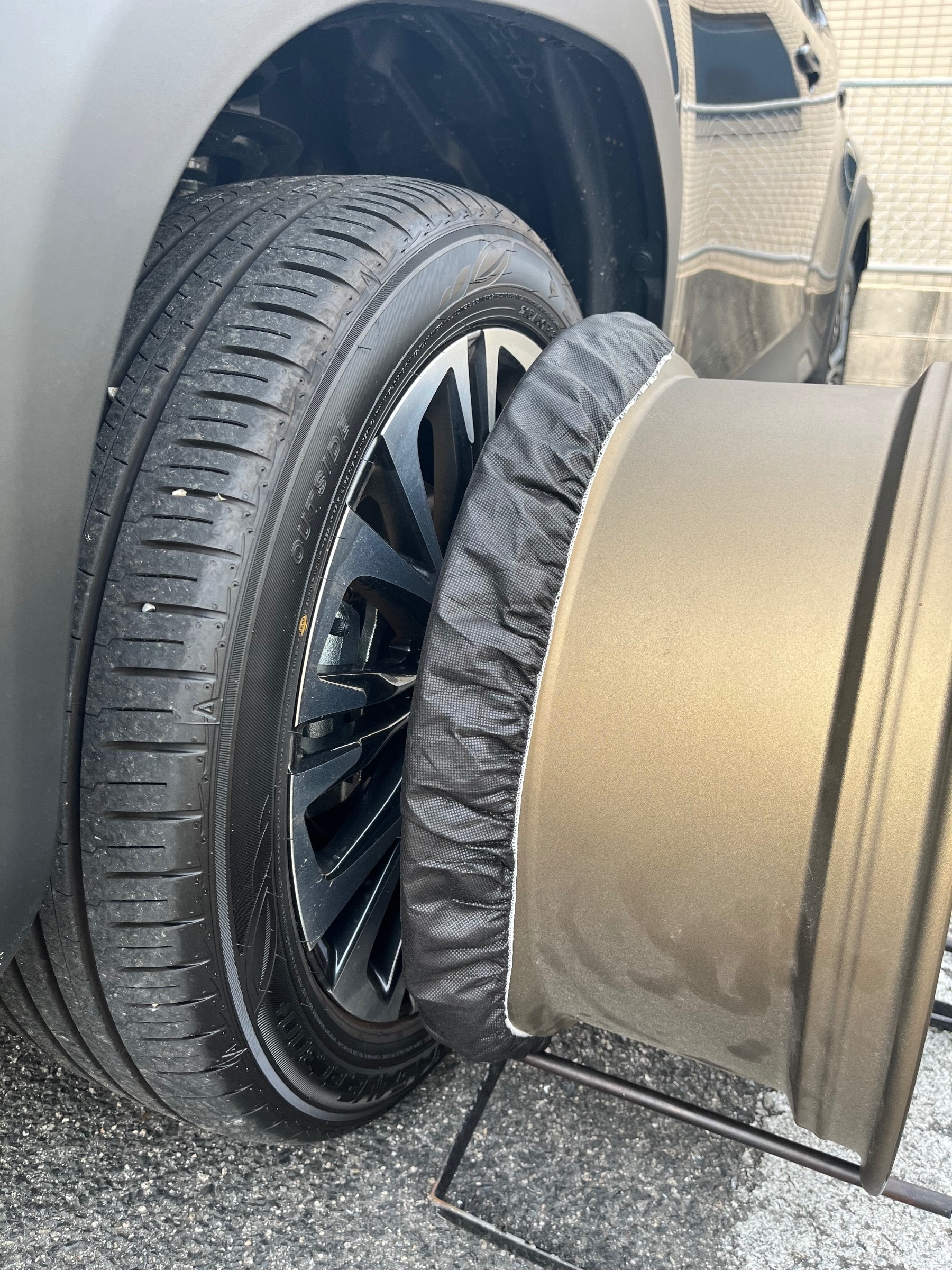 このような感じで、今履いてるホイールには当たらないようにやっているので傷がつく心配はありません。