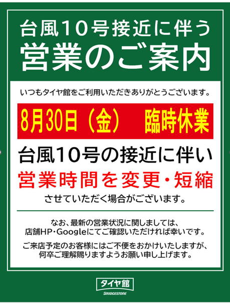 台風10号接近に伴う営業のご案内になります。