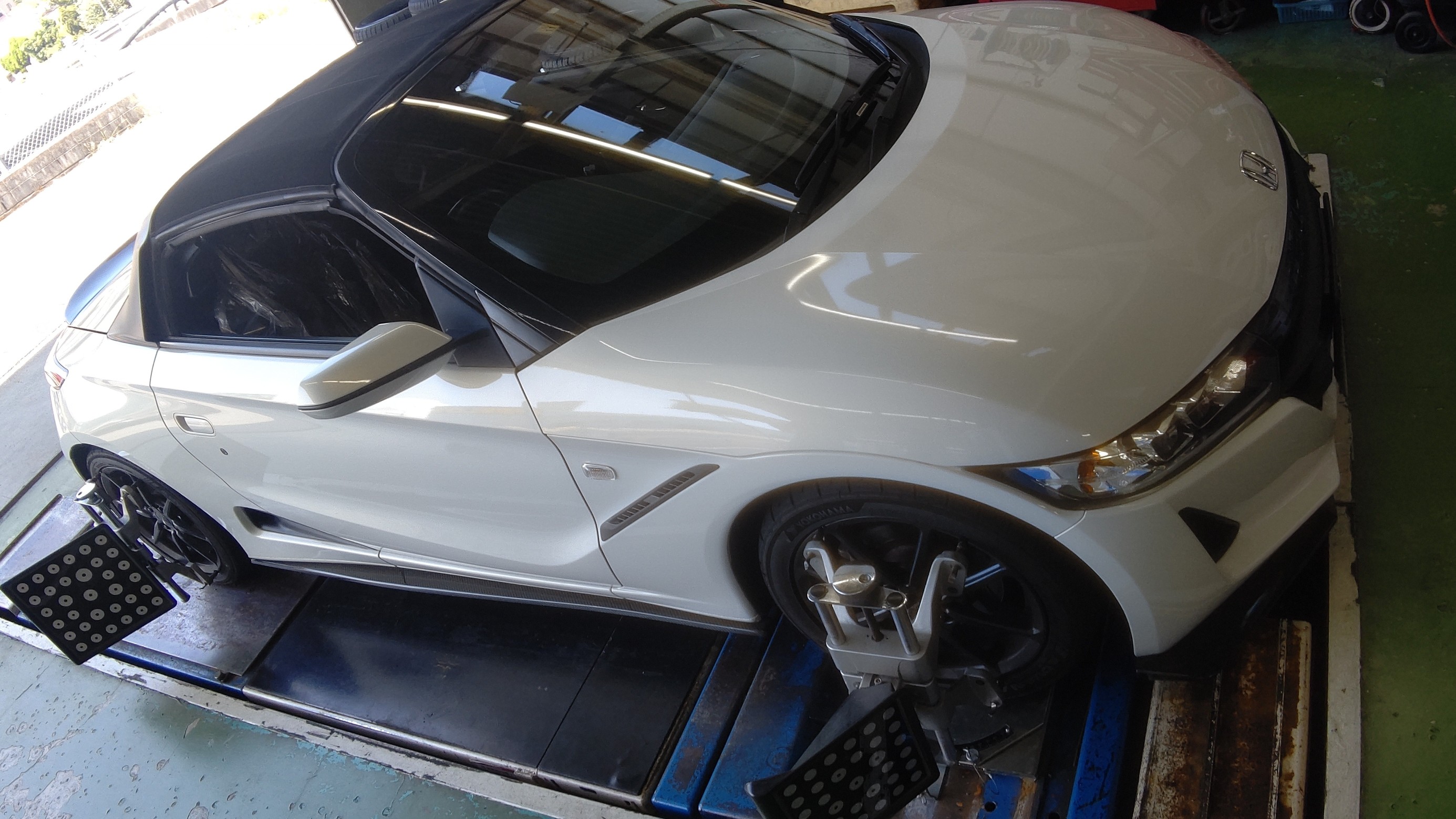 今回はホンダ S660のお客様からの依頼で足回りをやり替えたということでアライメント測定調整作業をさせていただきました。