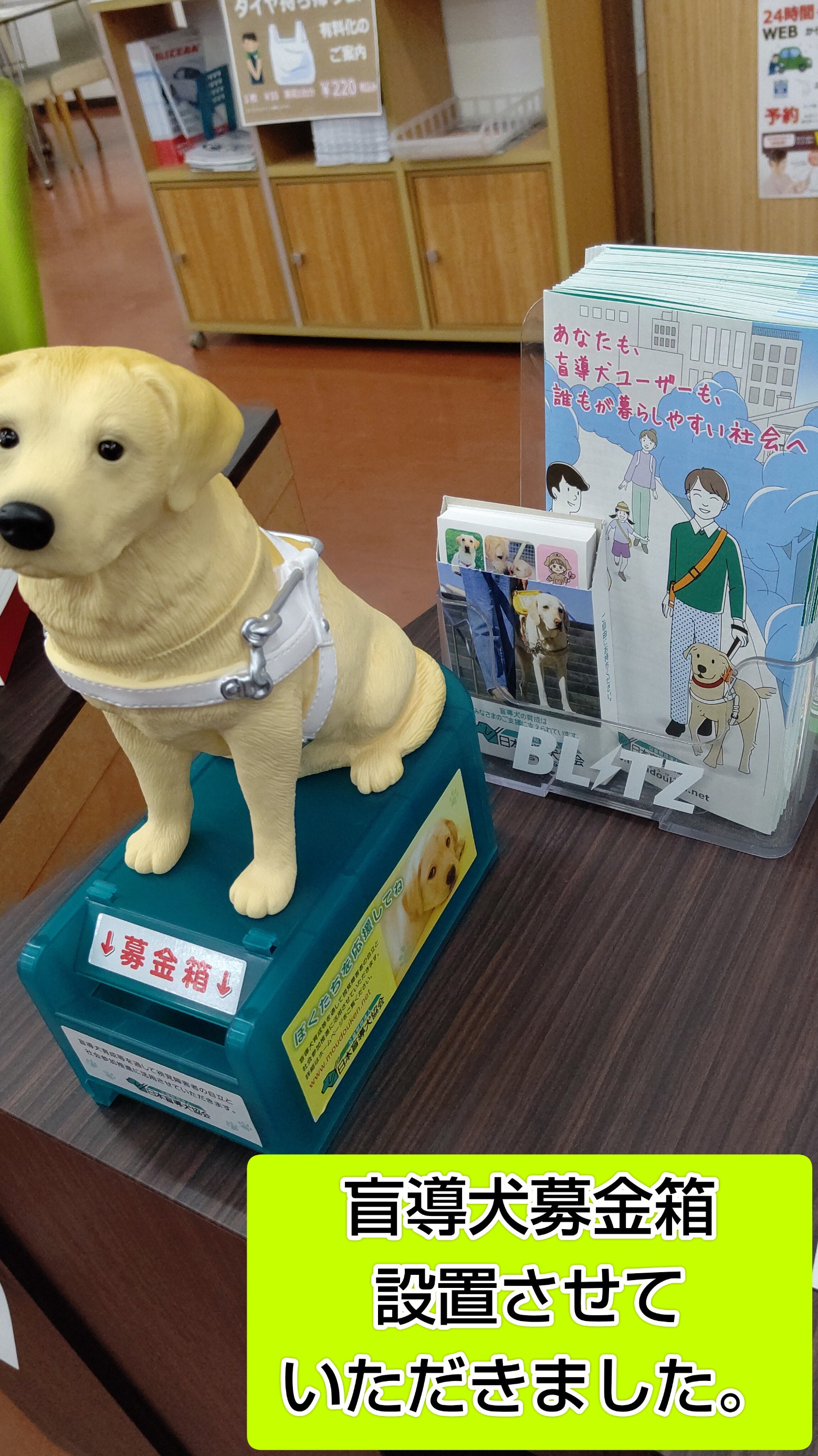 タイヤ館岩国に、盲導犬募金箱を設置させていただきました。 ポスト 2025年2月3日 タイヤ館岩国は、ブリヂストンタイヤ専門店になります。 当店のレジ付近に盲導犬募金箱をさせていただきました。 実は、ワタシの実家で一度、パピーウォーカーをしておりましてよく散歩をしてました。 全ての人が健やかに暮らせるためにもやさしい気持ちでご協力をお願いいたします。 タイヤ館 岩国 住所:740-0034山口県岩国市南岩国町3-8-62 電話番号: 0827-34-1133 カテゴリ:お知らせ 担当:池田