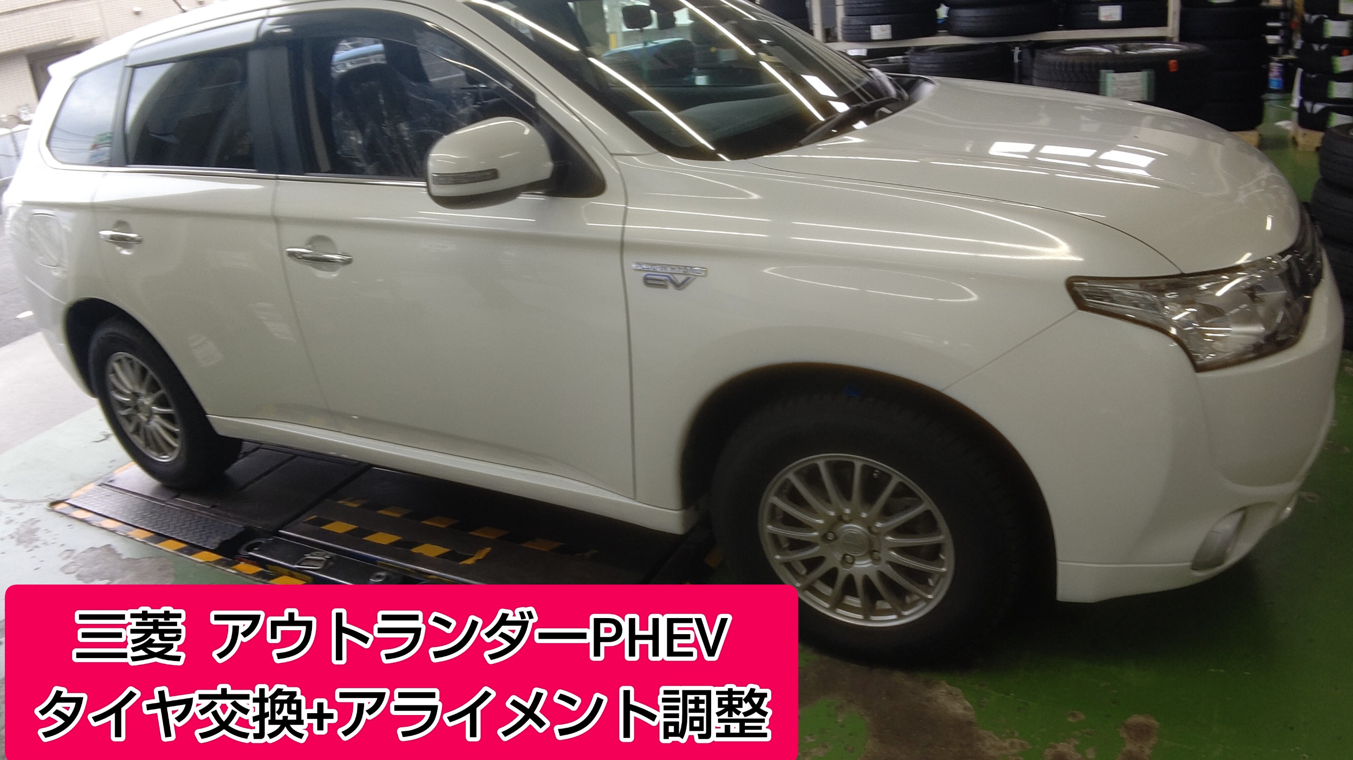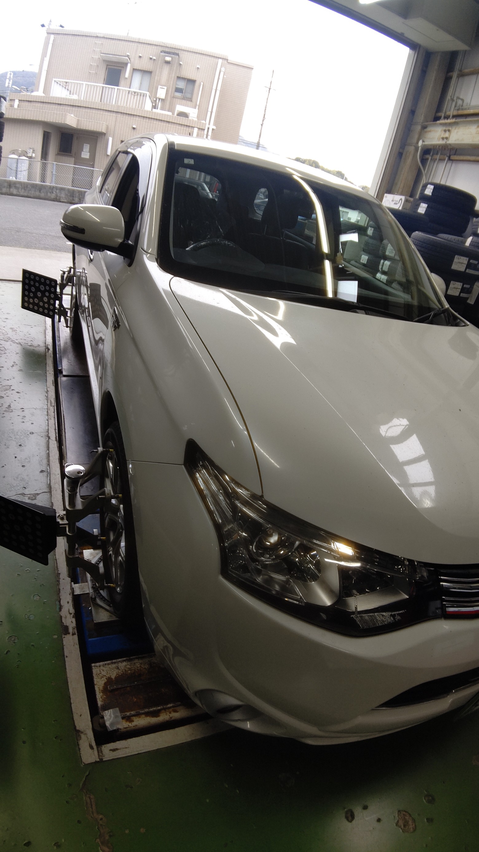 タイヤ館岩国で、三菱 アウトランダーPHEVのスタッドレスタイヤからの履き替え作業時に新品タイヤへの購入取付作業とアライメント測定調整作業をさせていただきました。