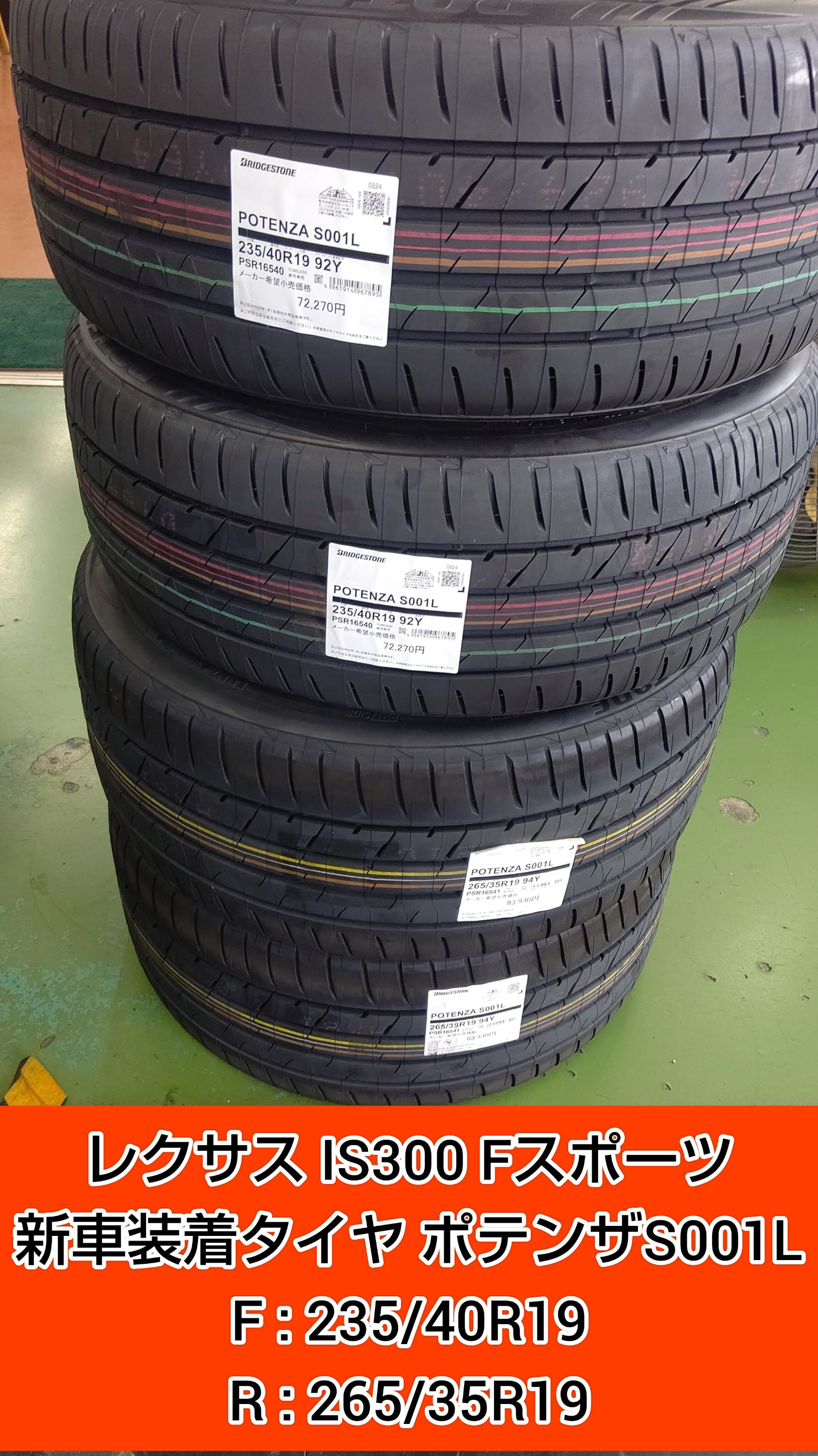 実は通常販売しているポテンザS007Aではフロントタイヤのサイズ設定が無いので新車装着タイヤを選択しました。