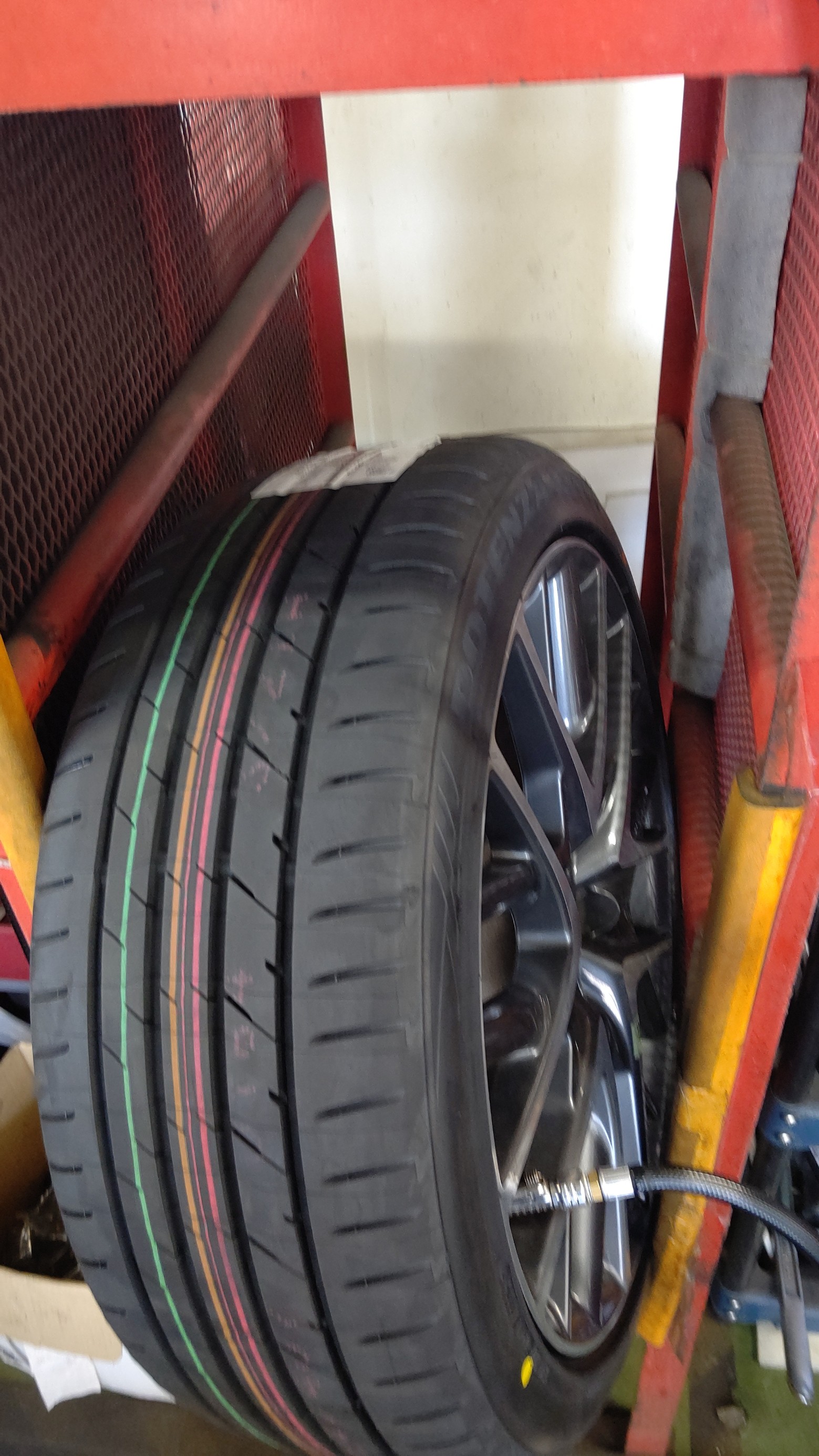 タイヤを組み付け後は安全柵に入れて空気圧を充填していきます。
