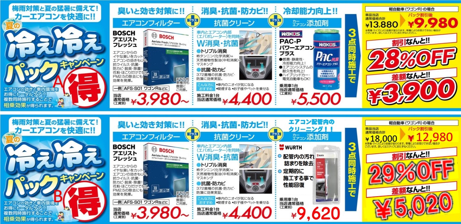 エアコンフィルター+車内除菌+エアコンガス添加剤をセットでお得な価格で提供しております。