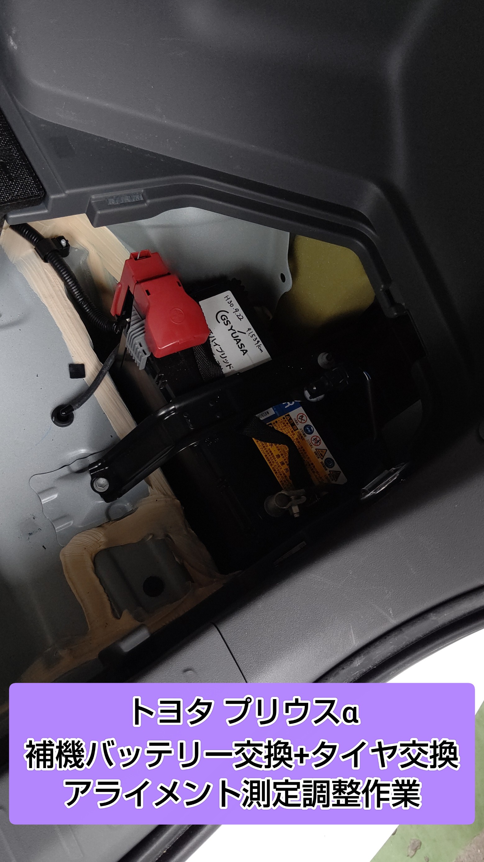 タイヤ館岩国で、トヨタ プリウスアルファの補機バッテリー交換とタイヤ購入取付作業とアライメント測定調整作業をさせていただきました。