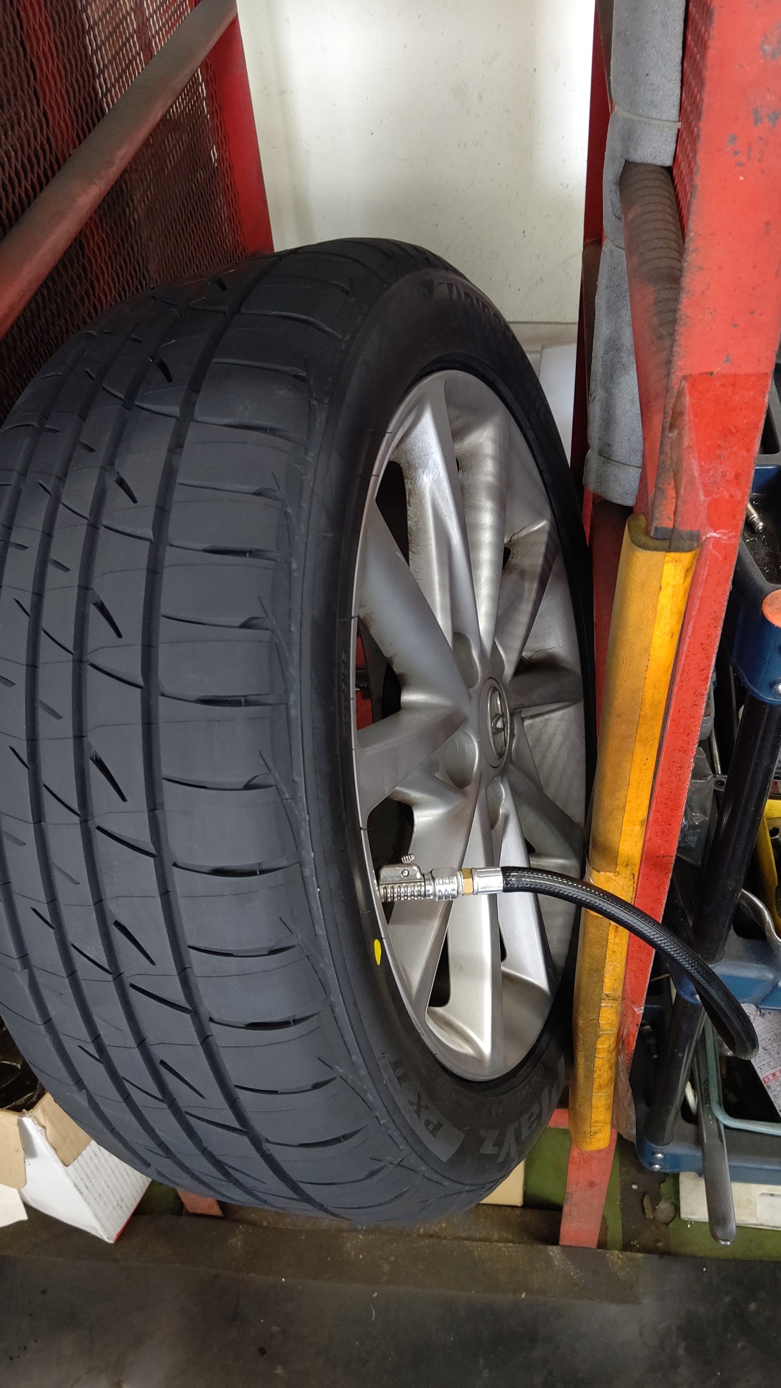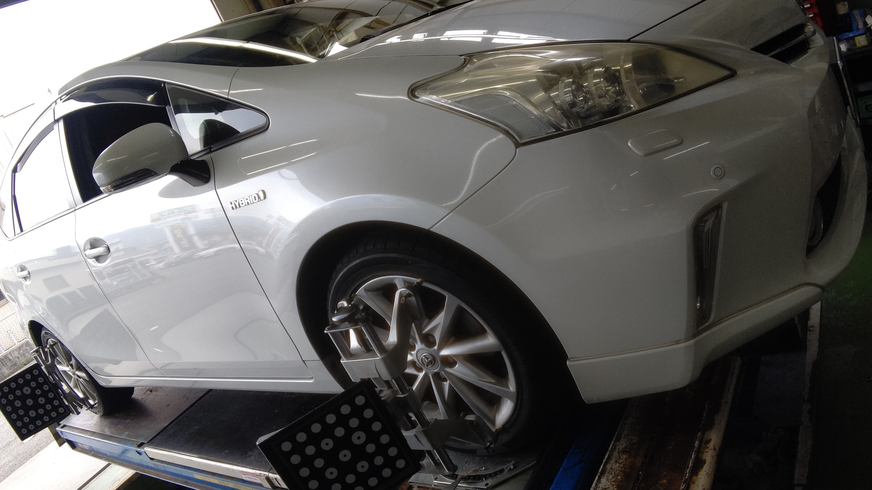 今回は、いつもご利用されているプリウスアルファのお客様からの依頼で補機バッテリー交換とタイヤ購入取付作業とアライメント測定調整作業をさせていただきました。
