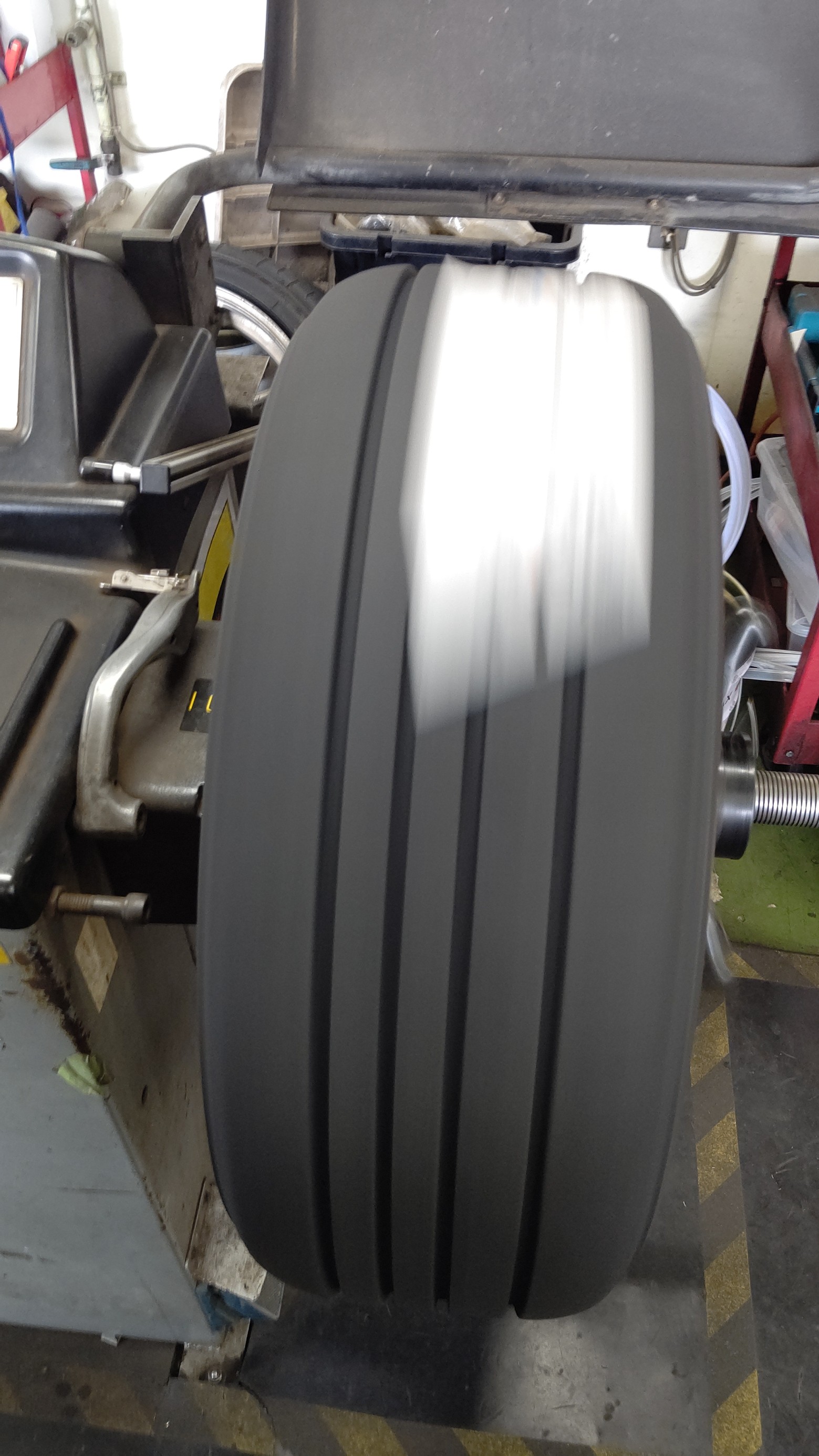 今までのタイヤを取り外して新しいタイヤを組み付け安全柵に入れて空気圧を充填していきます。