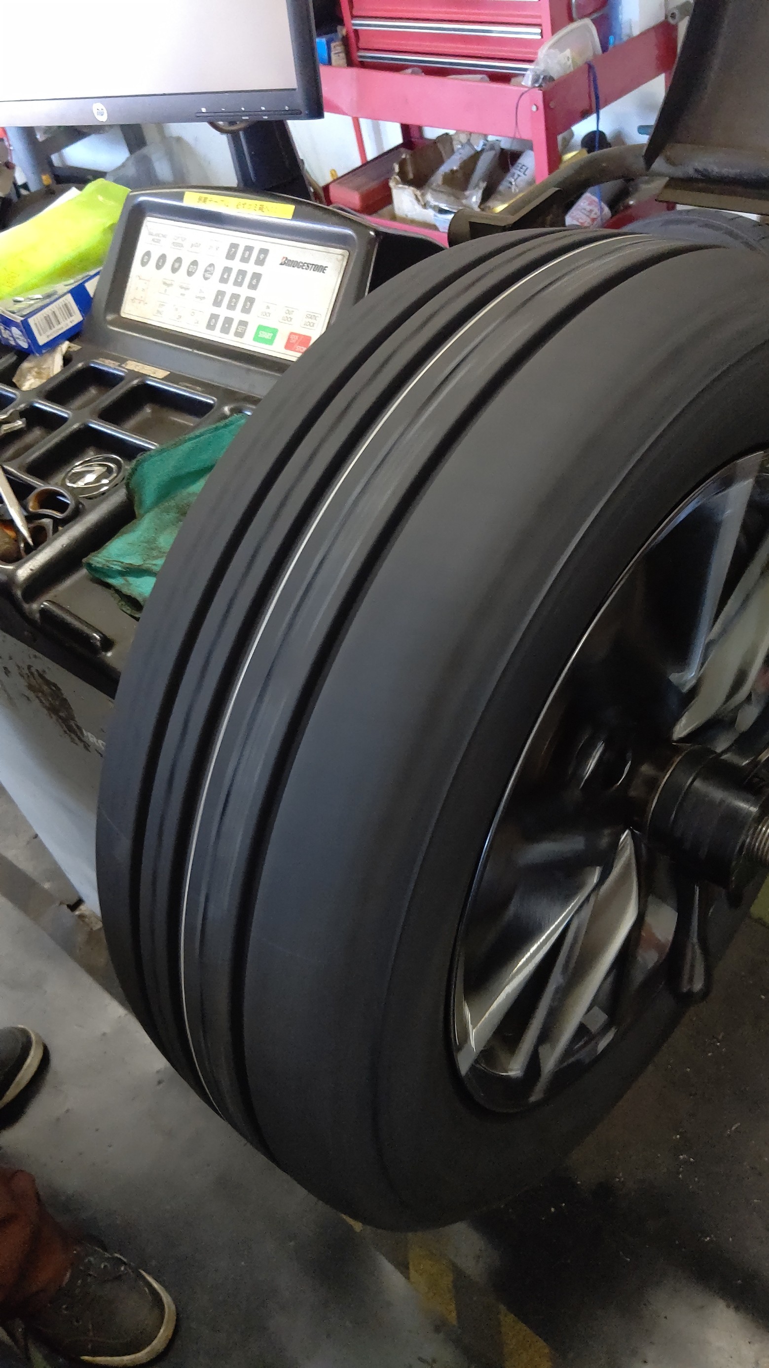 車体からタイヤホイールを取り外して新しいタイヤを組み込んで空気圧を充填してバランス調整作業をしていきます。
