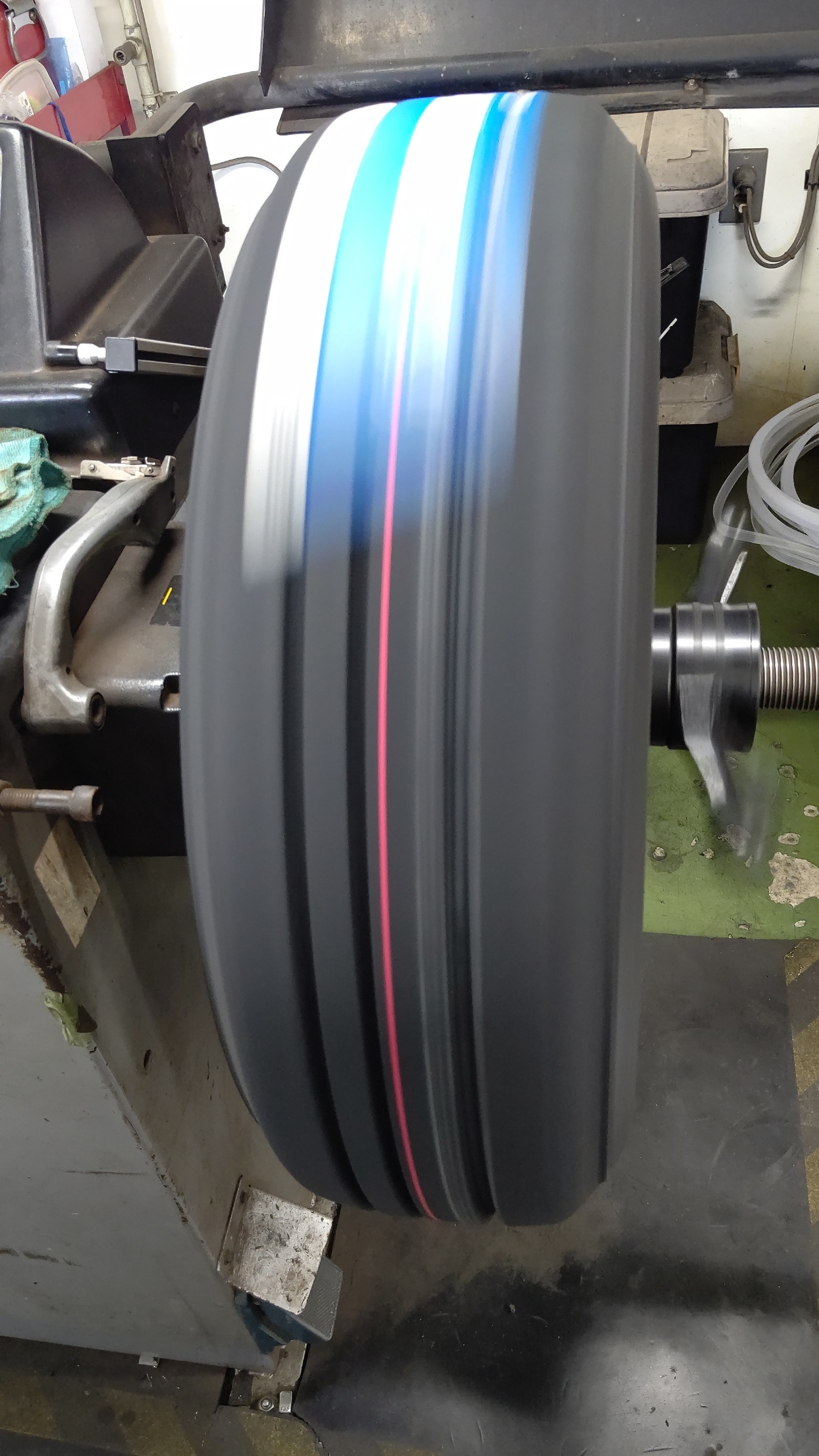 新しいタイヤを組み付けして安全柵に入れて空気圧を充填していきます。