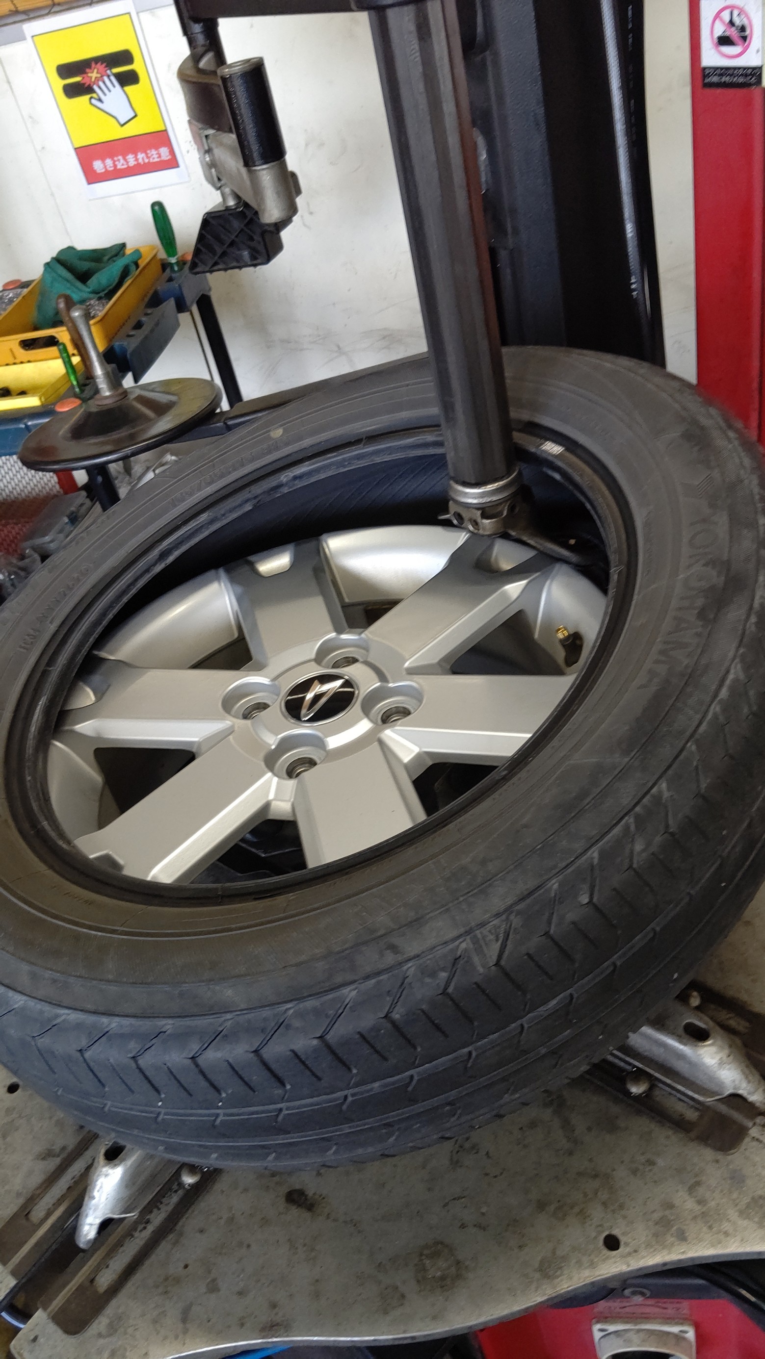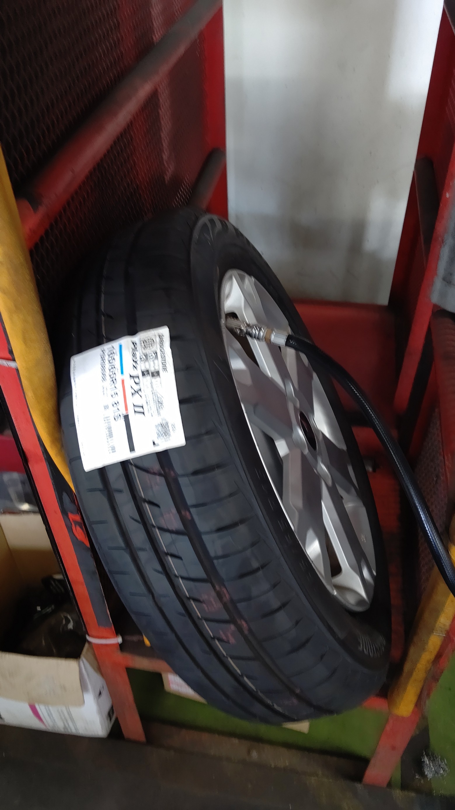 新しいタイヤを組み付けして安全柵に入れて空気圧を充填していきます。