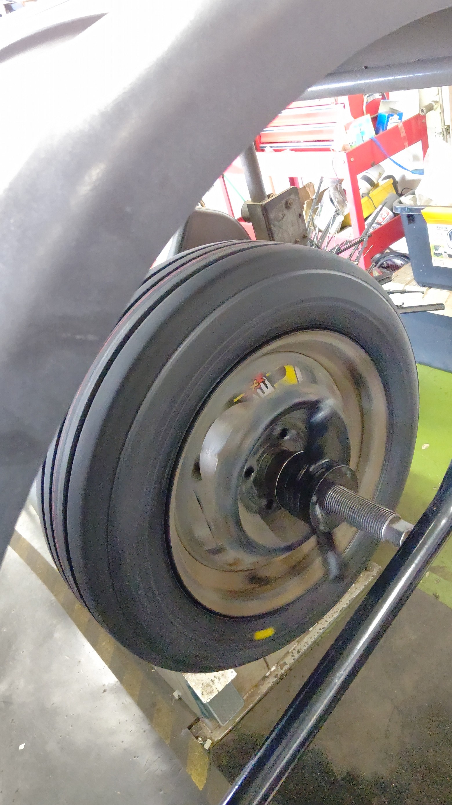 新しいタイヤを組み付けして安全柵に入れて空気圧を充填していきます。