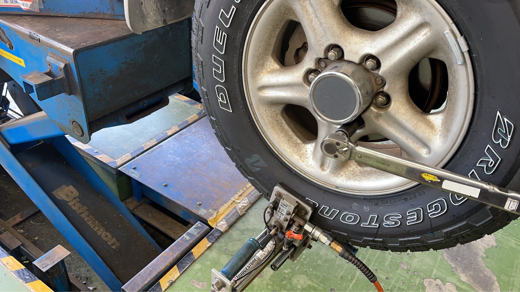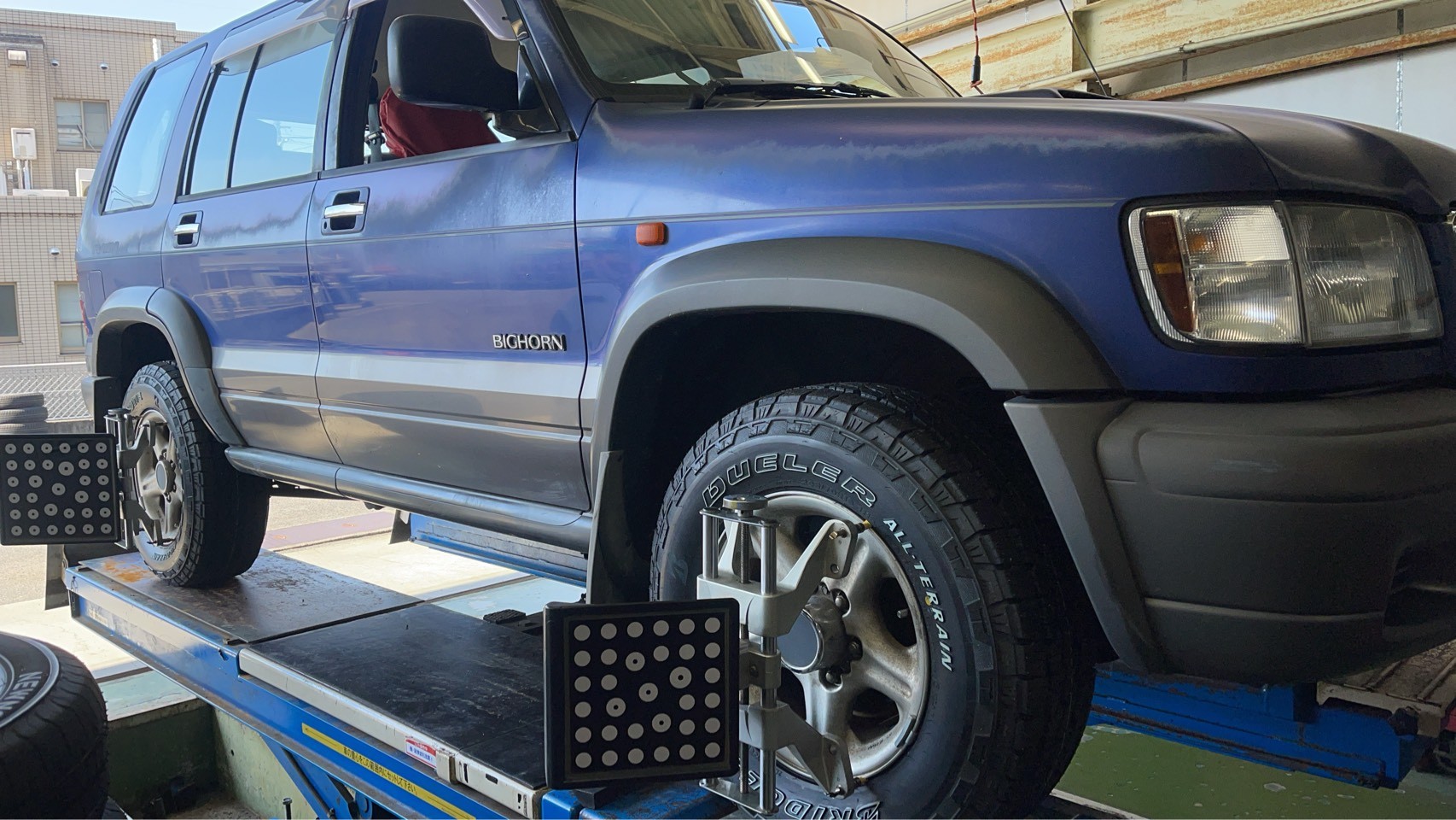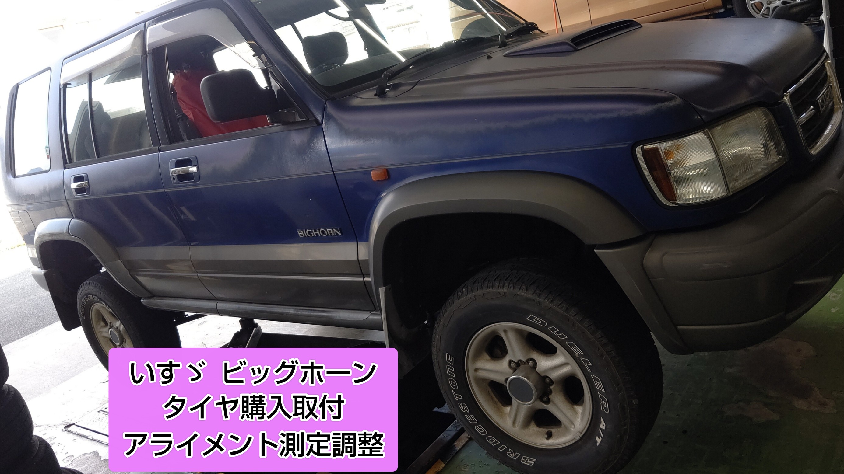 今回はいつもご利用されているいすゞ ビッグホーンのお客様からの依頼でタイヤ購入取付作業とアライメント測定調整作業をさせていただきました。