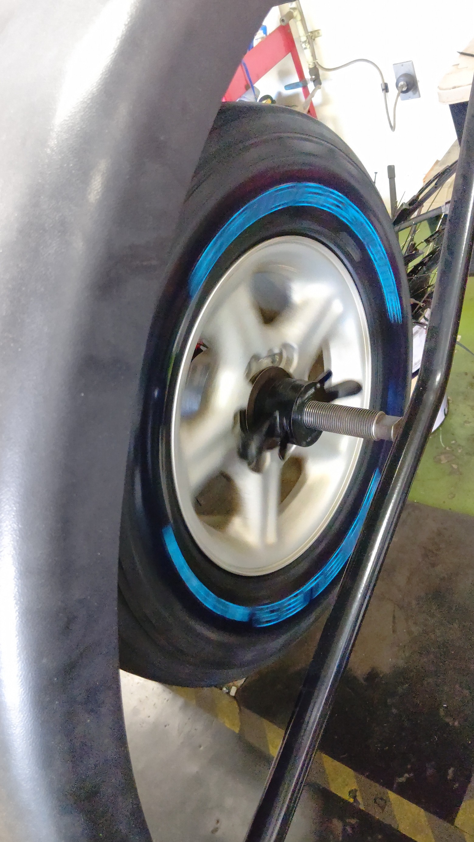 車体からタイヤホイールを外して新しいタイヤを組み付けしていきます。