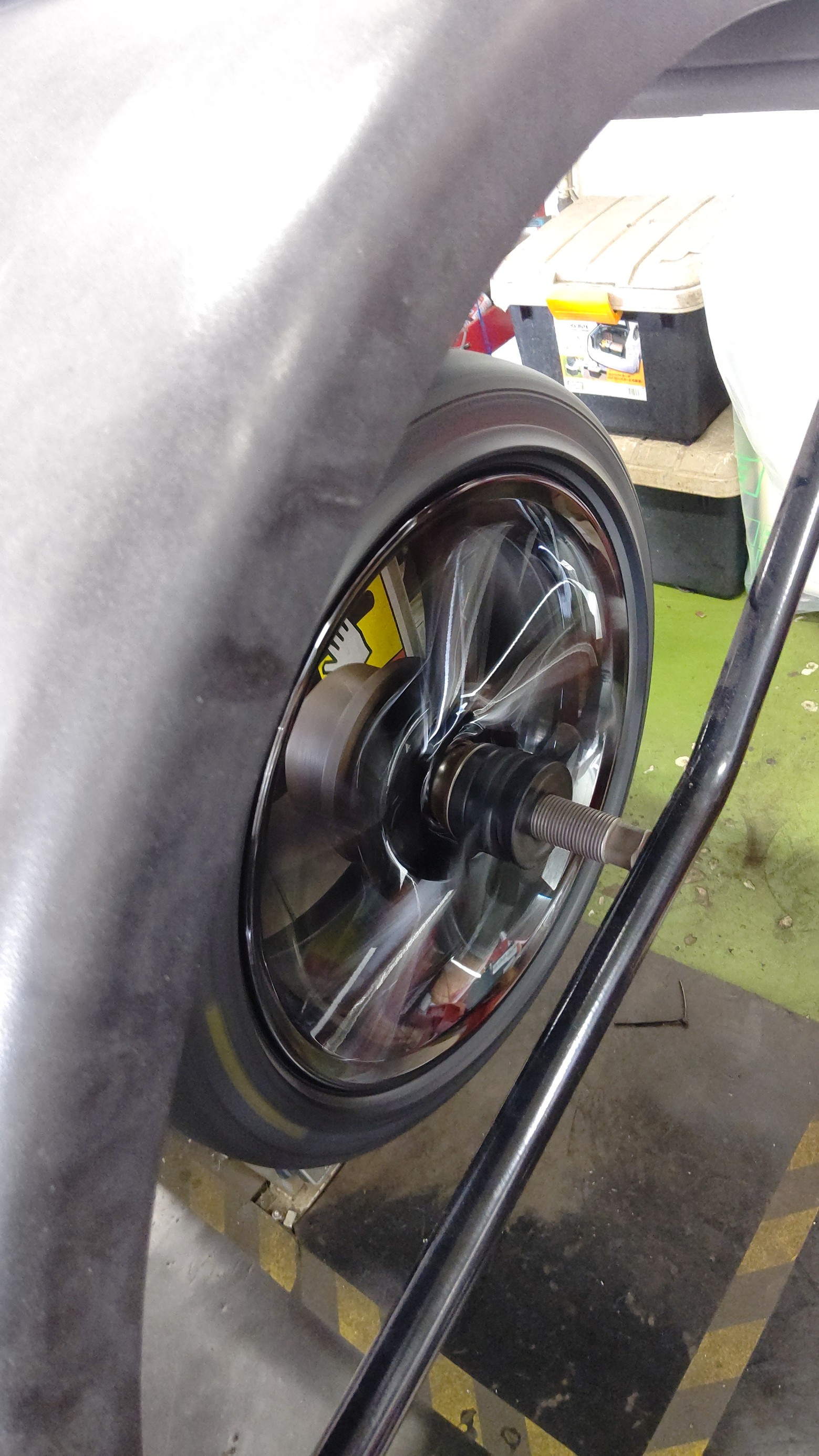 車体からタイヤホイールを取り外して今までのタイヤから新しいタイヤを組み付けしていきます。