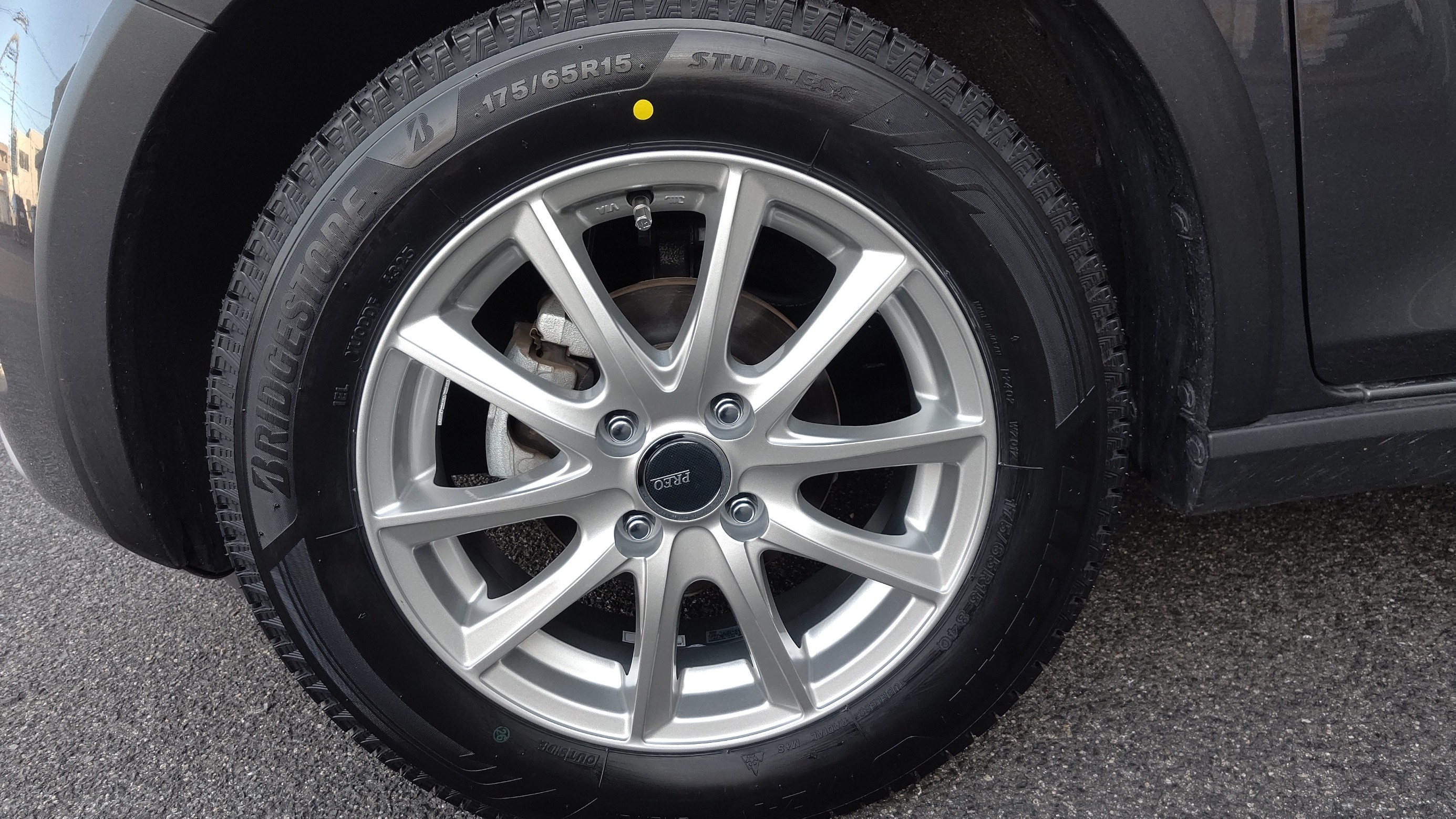 スタッドレスタイヤとホイールを組み付けして車体に取り付けしていきます。