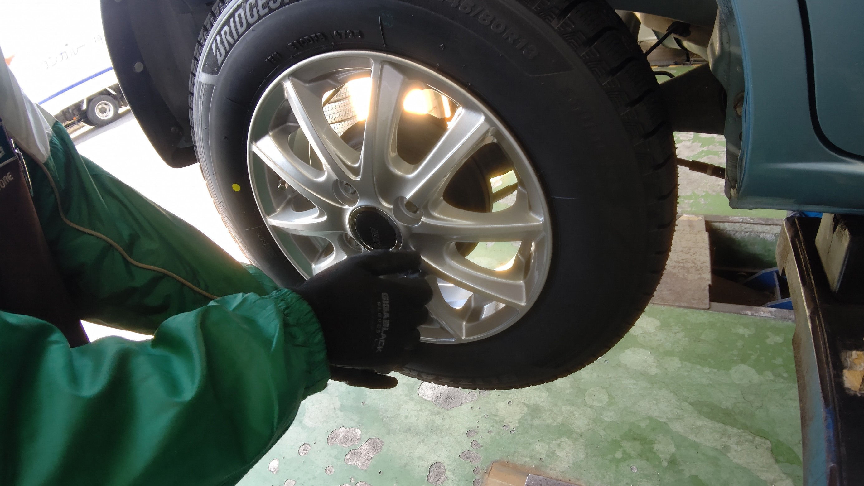 今回は初めて来られたマツダ キャロルにお乗りのお客様からの依頼でスタッドレスタイヤとホイールセットの購入取付作業をさせていただきました。