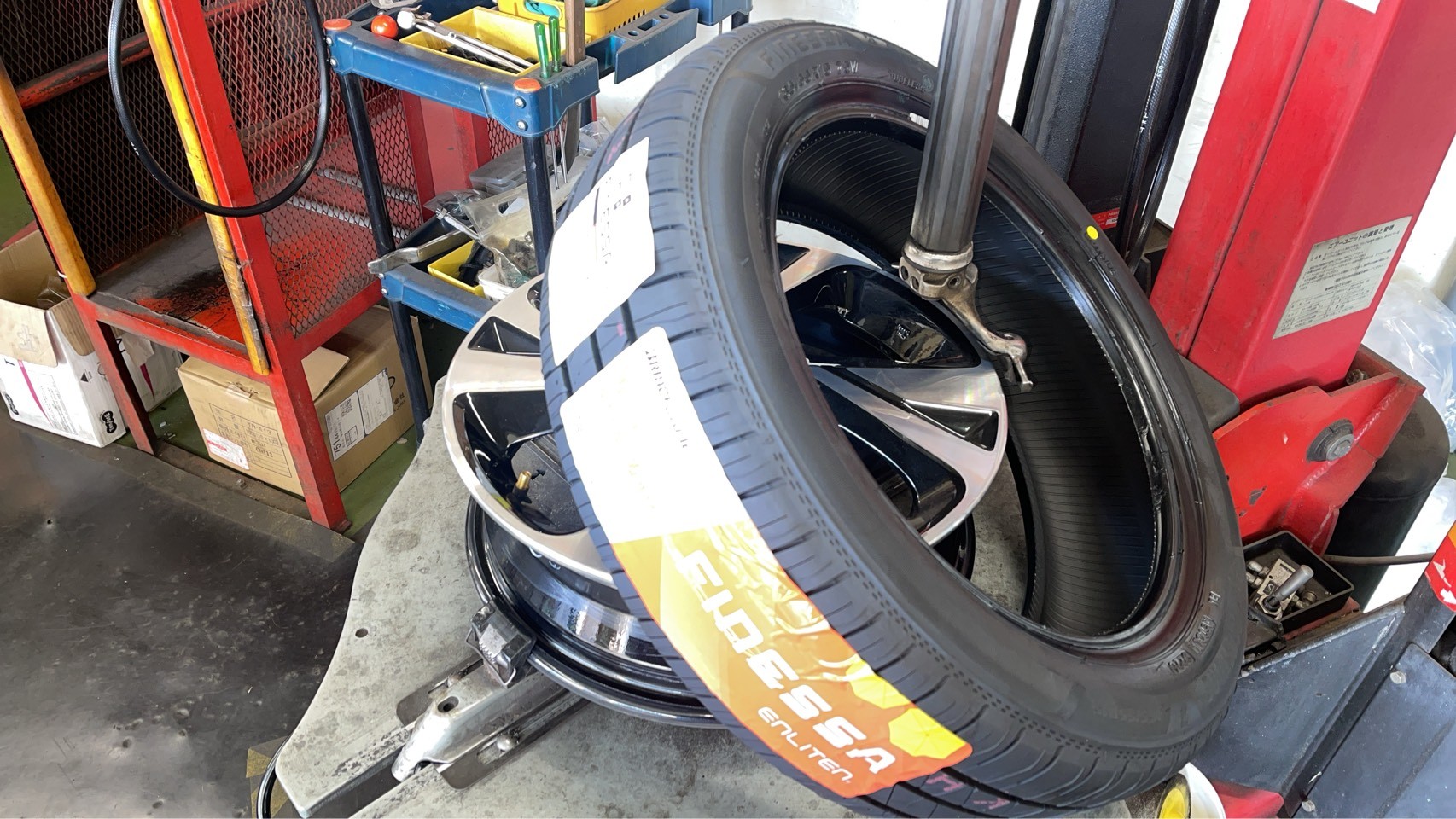 タイヤホイールを取り外して今までのタイヤを取り外して新しいタイヤを組み付けしていきます。
