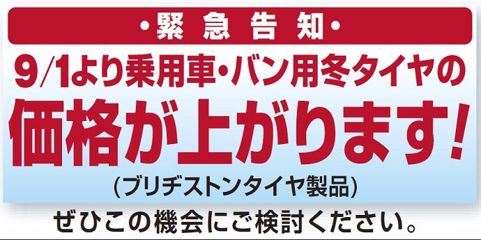 9月より乗用車・バン用冬タイヤの価格が上がります。