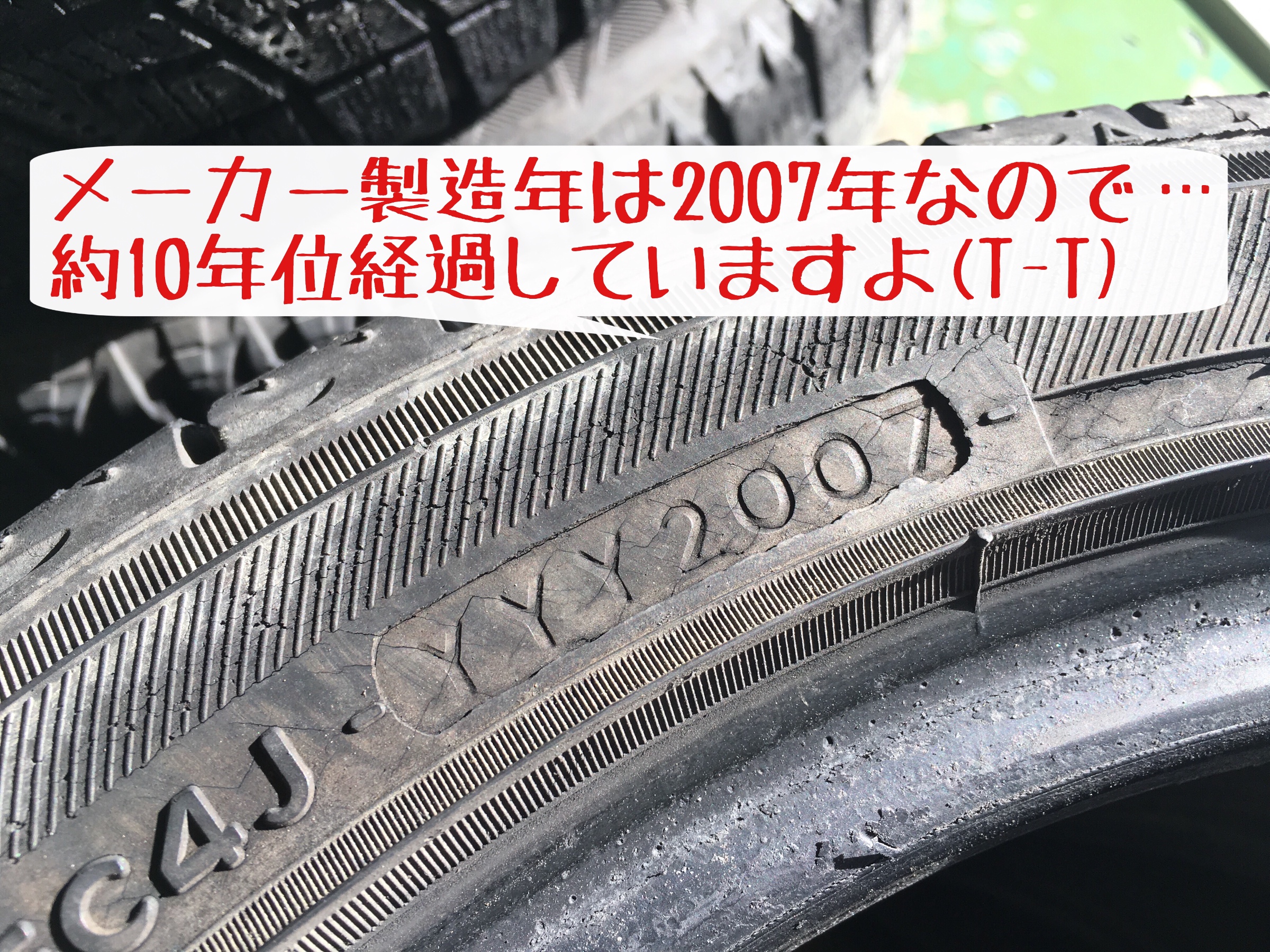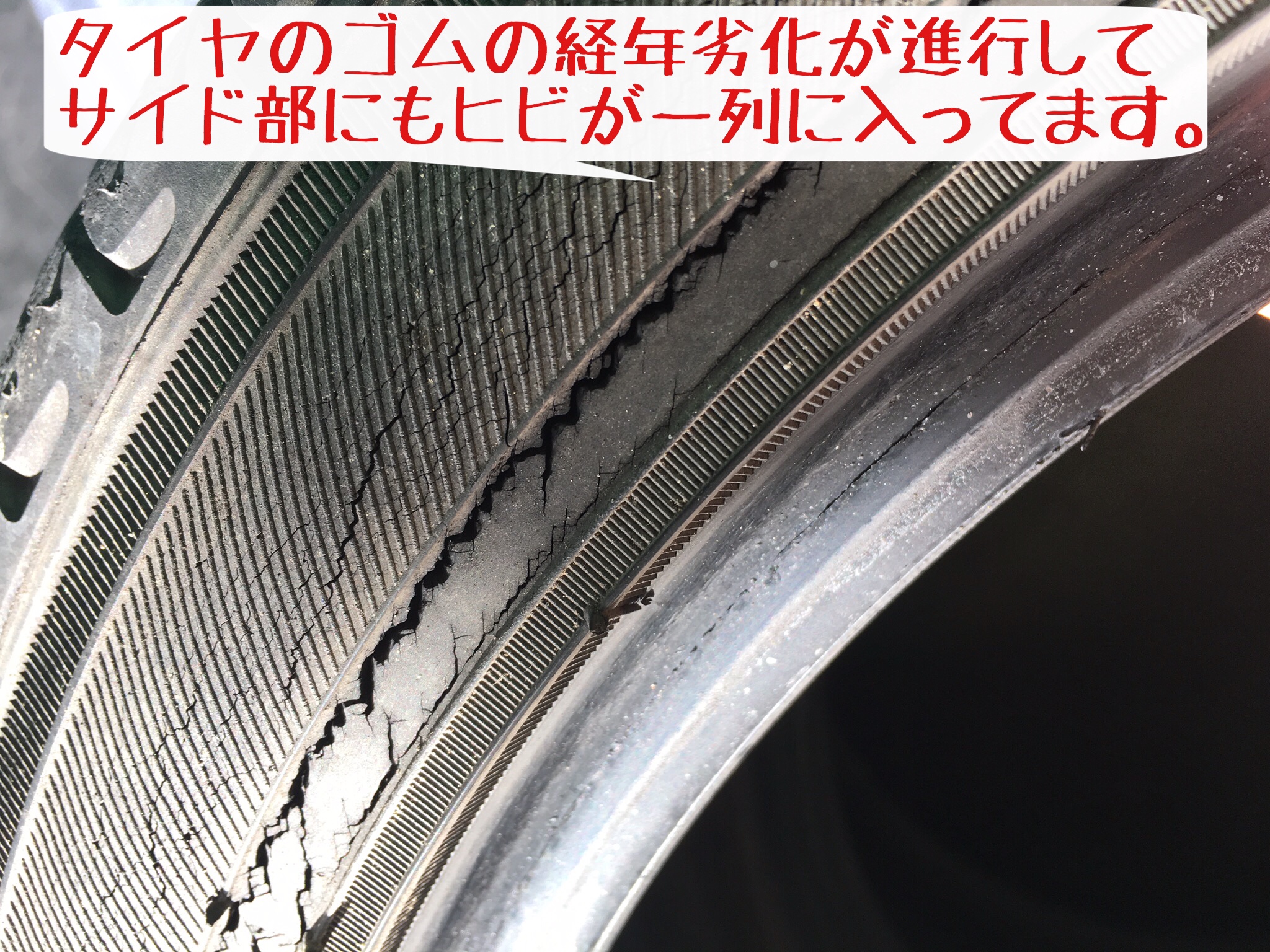 写真は経年劣化したタイヤです。