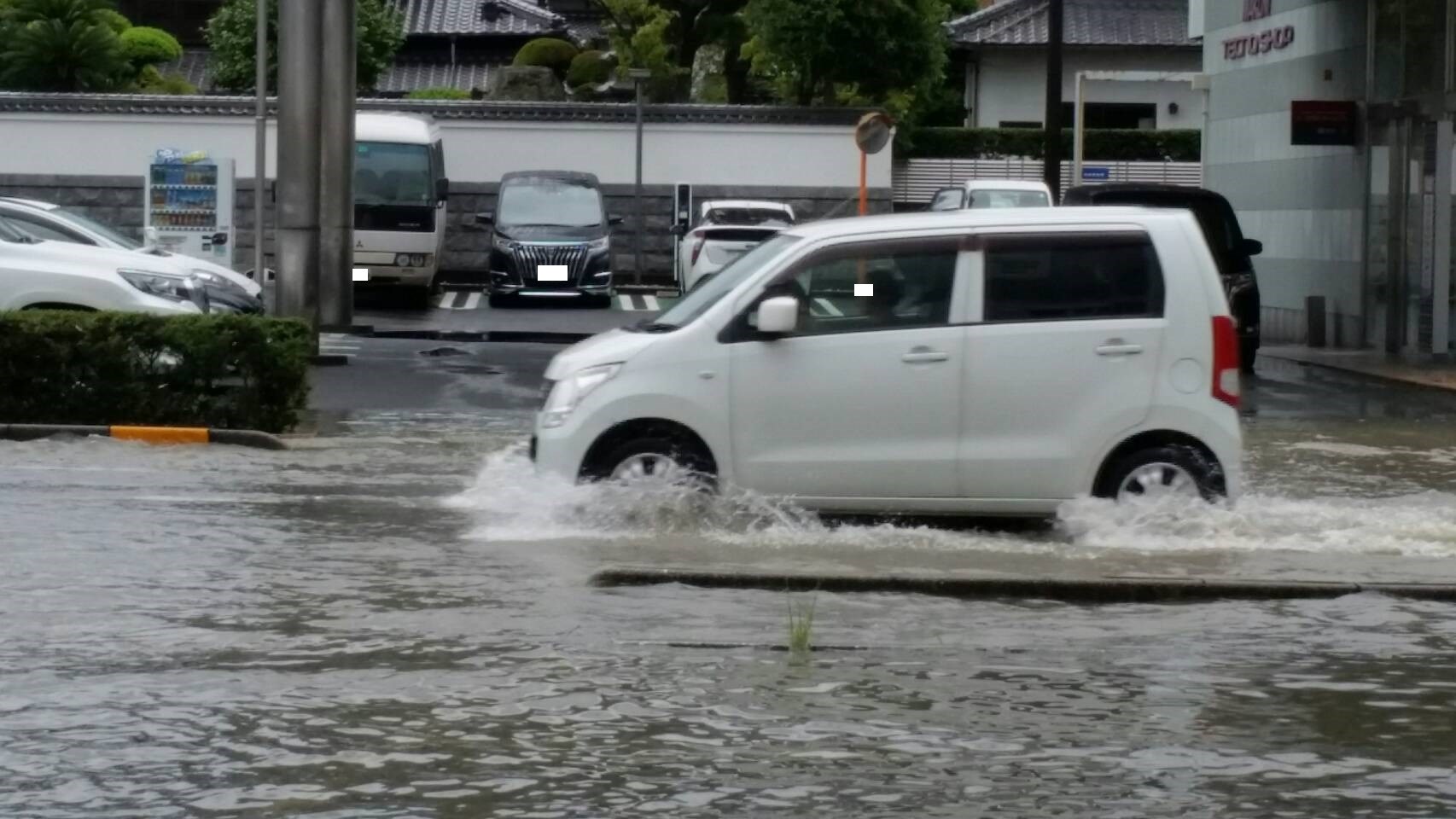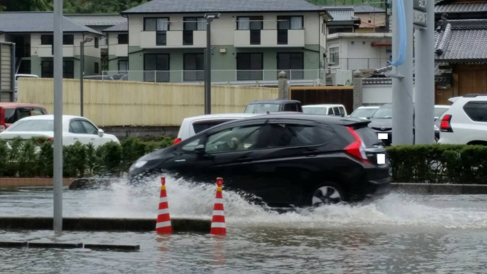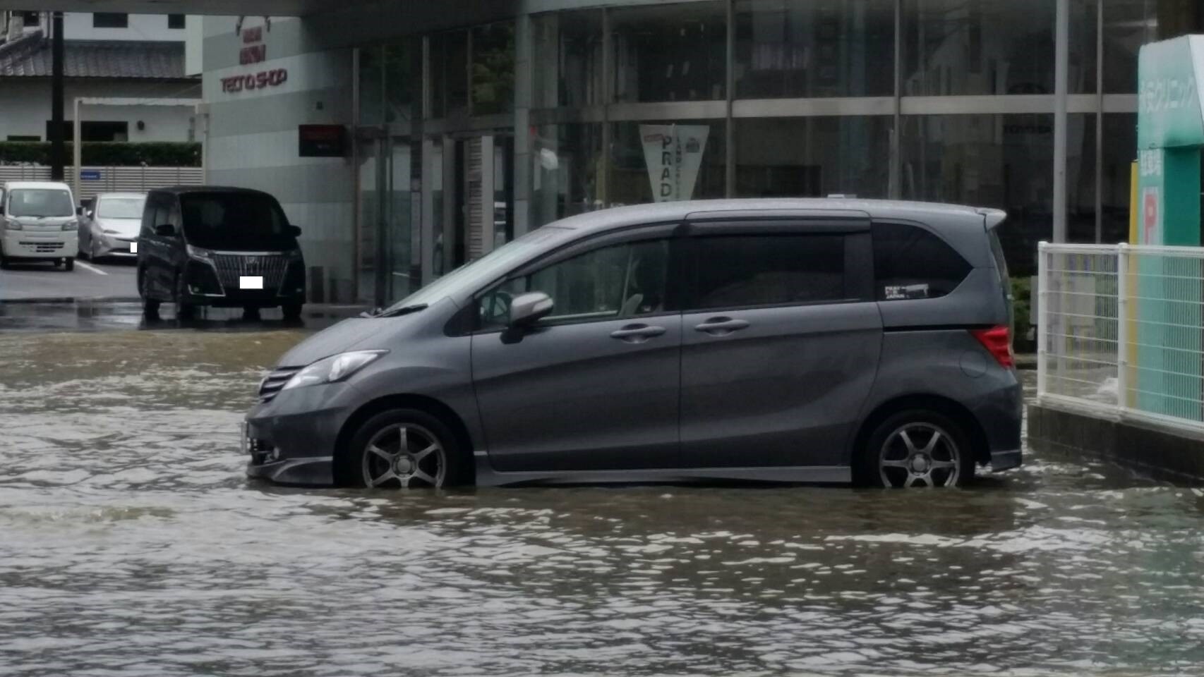 車高が高くても、冠水で道路が見えないと、走行すると危険です。