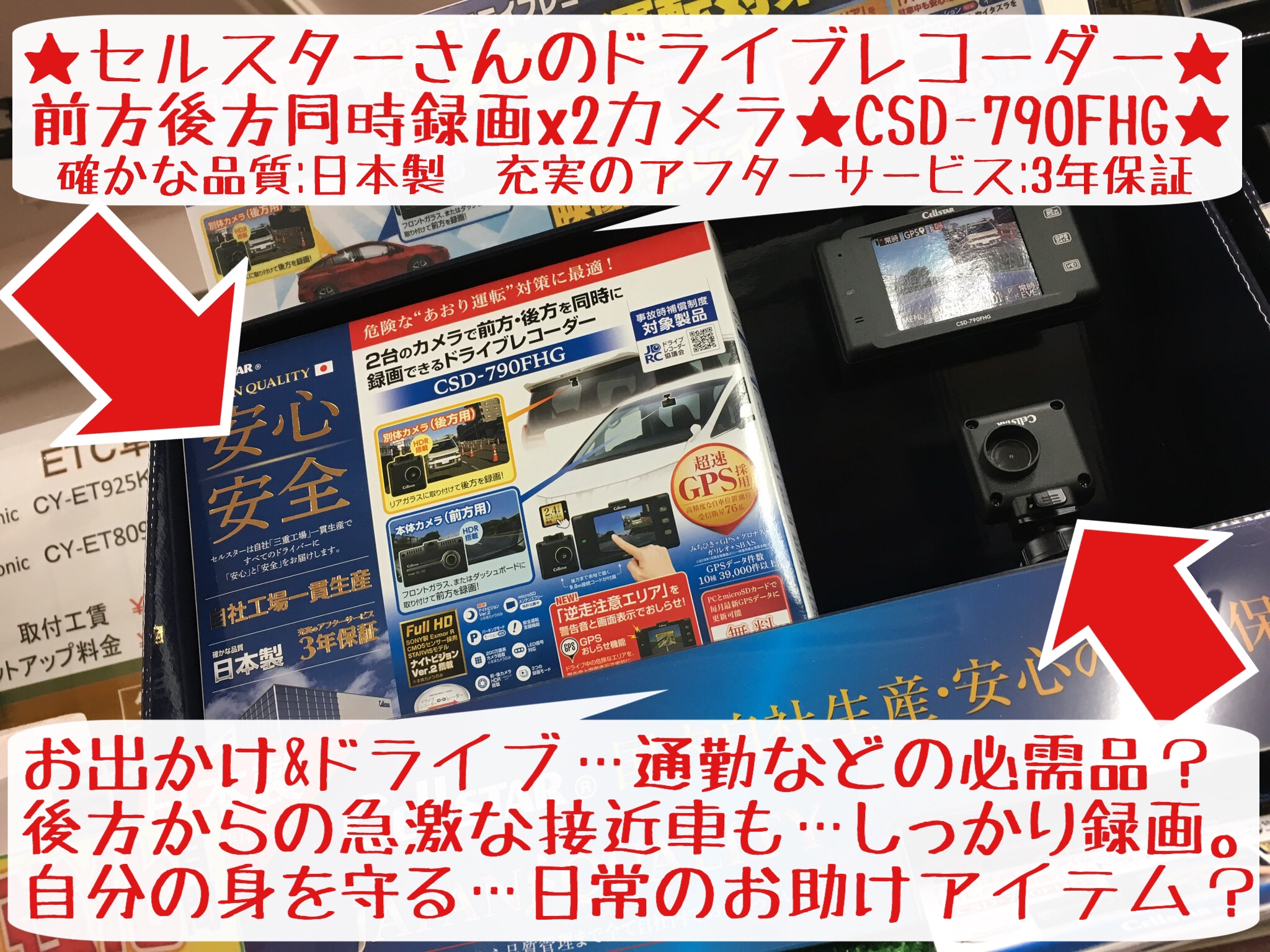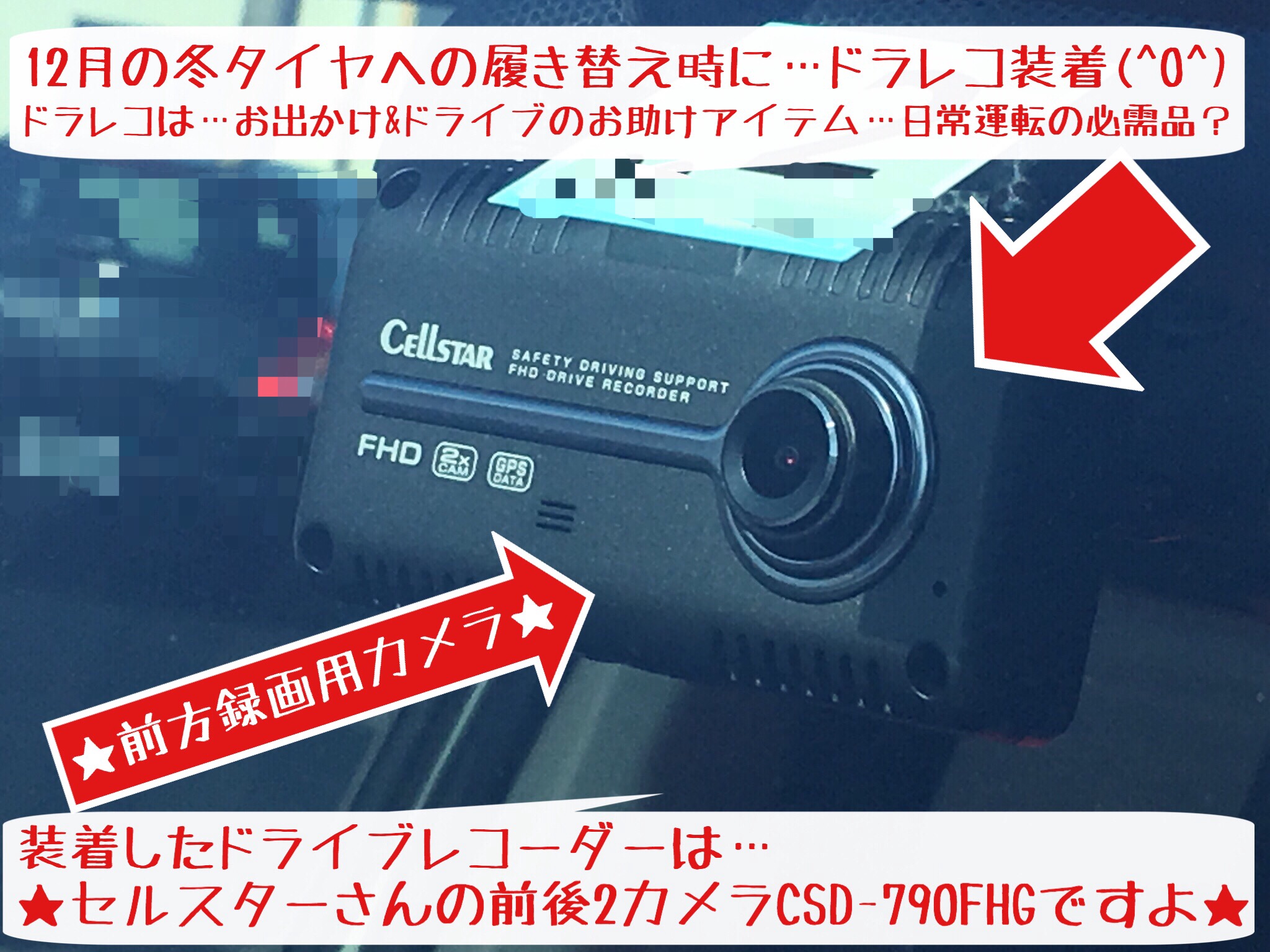 装着ドラレコは・・・セルスターさんの前後2カメラタイプになりますよ。