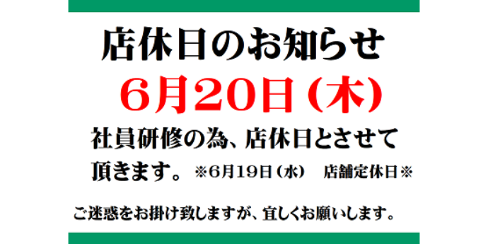 6月の臨時店舗定休日のお知らせです。