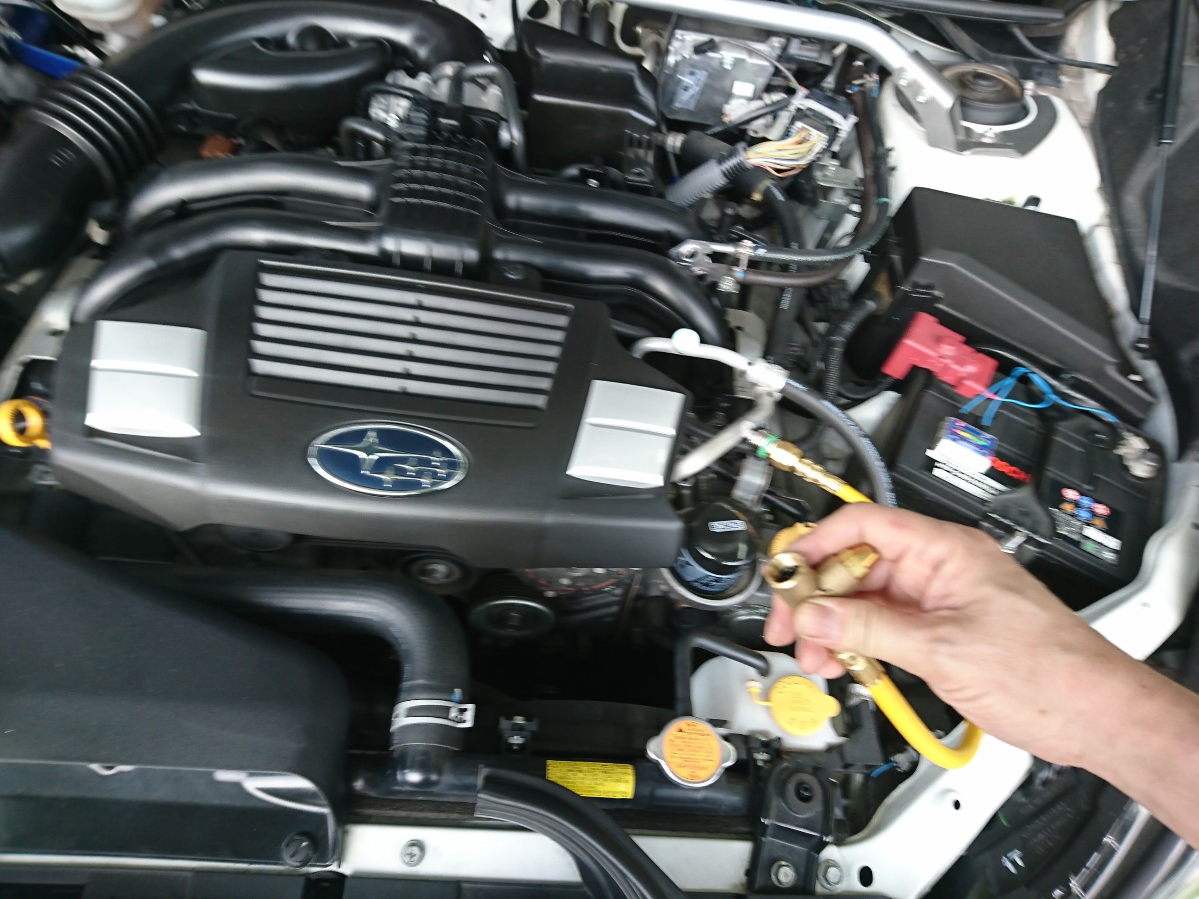 まずは専用ホースを接続してからエアコンを全開にしてから注入!