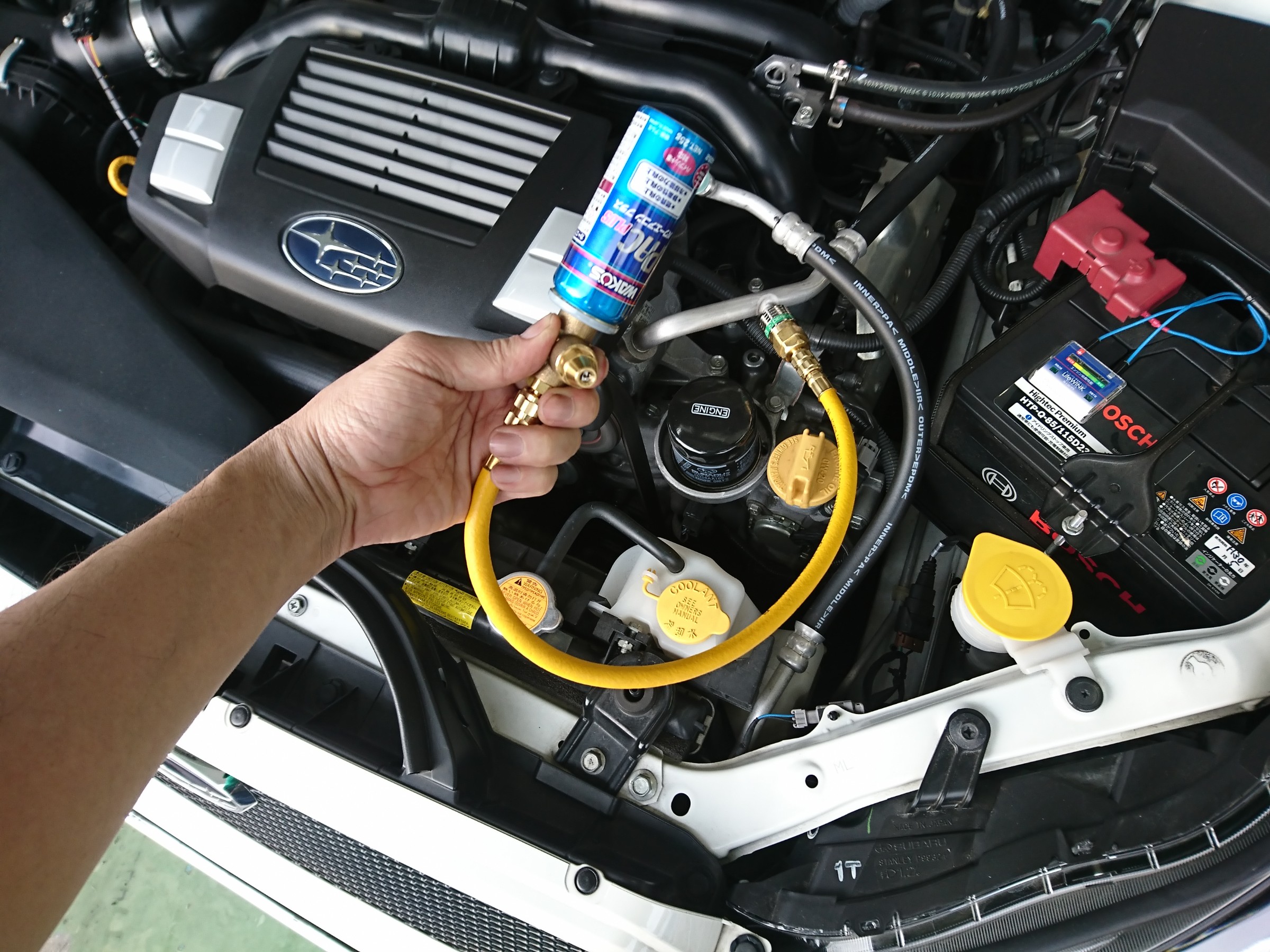 そこでクーラーの効きをよくしようと前回、店長のクルマにも入れたワコーズさんの『パワーエアコンプラス』を入れたいと、このタイヤ館webを見て来てくれた方が!