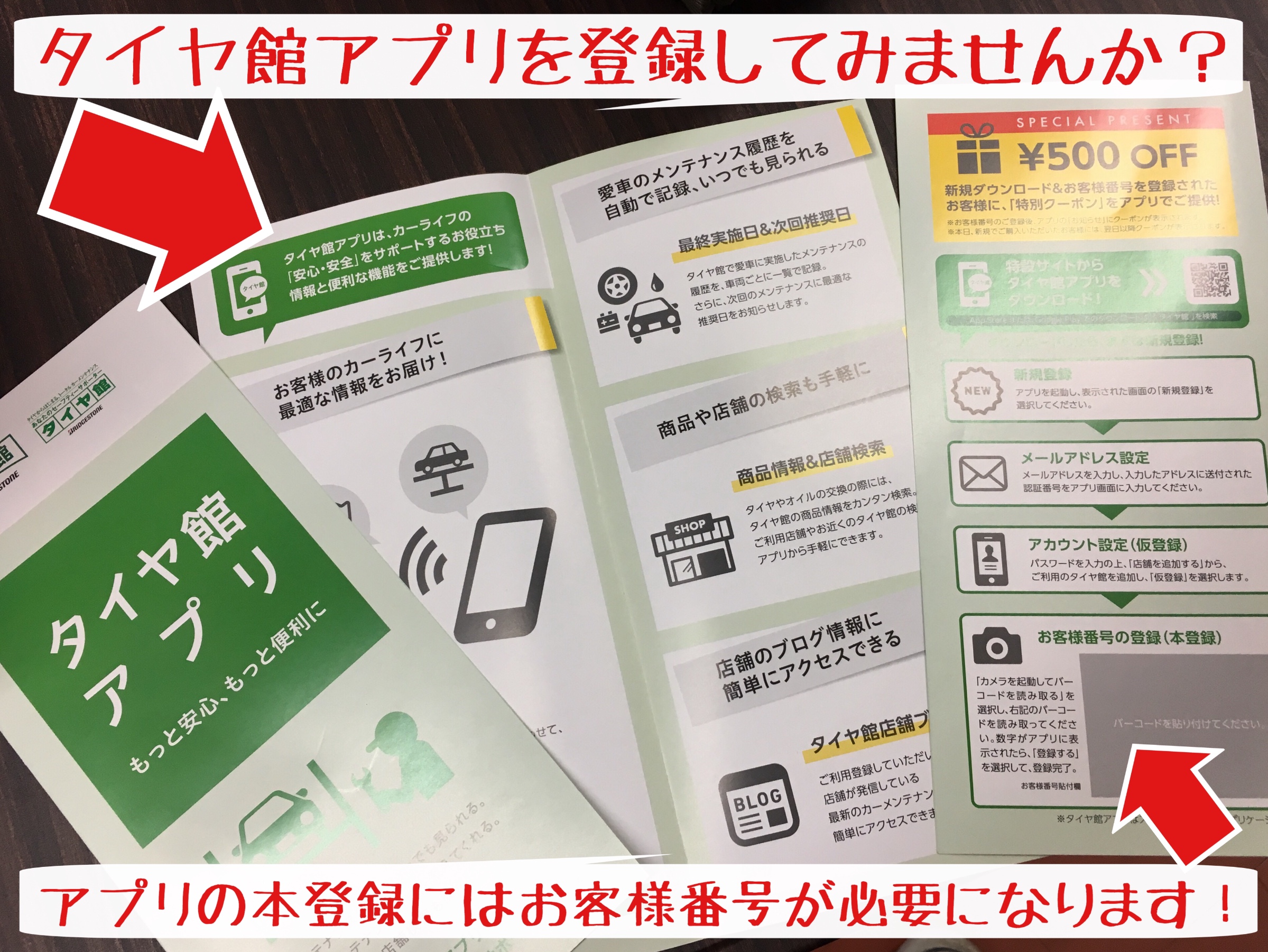 アプリの本登録にはお客様番号が必要になりますので・・・分からない方はスタッフまでお尋ねください(タイヤ館のご利用が初めての方には・・・お客様番号を発行させて頂きますよ)