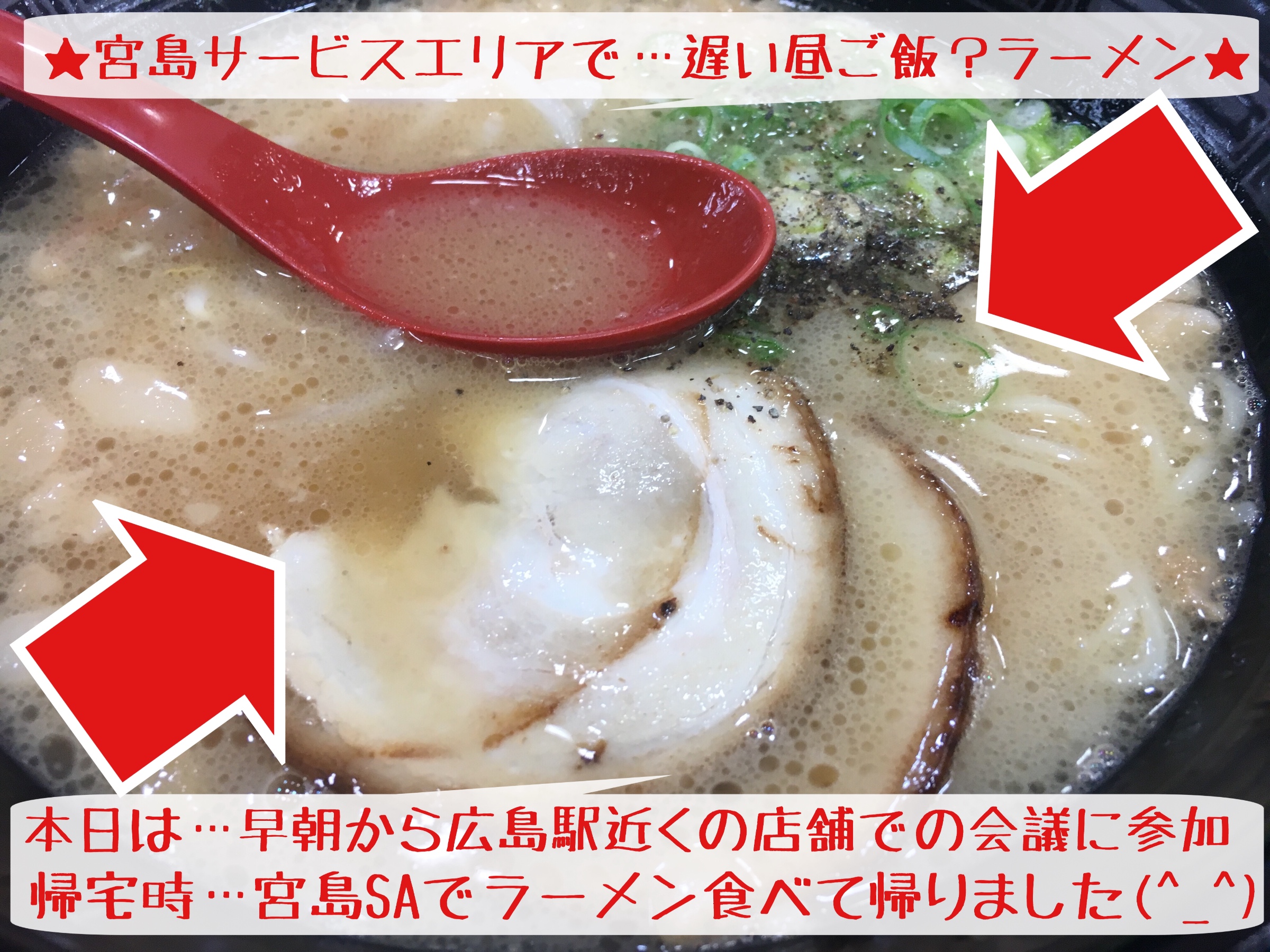 帰りに…途中の宮島サービスエリアで少し遅めのお昼ラーメン頂きましたー(^_^)お腹も空いていたので…瞬食でしたよ。美味しかったです。