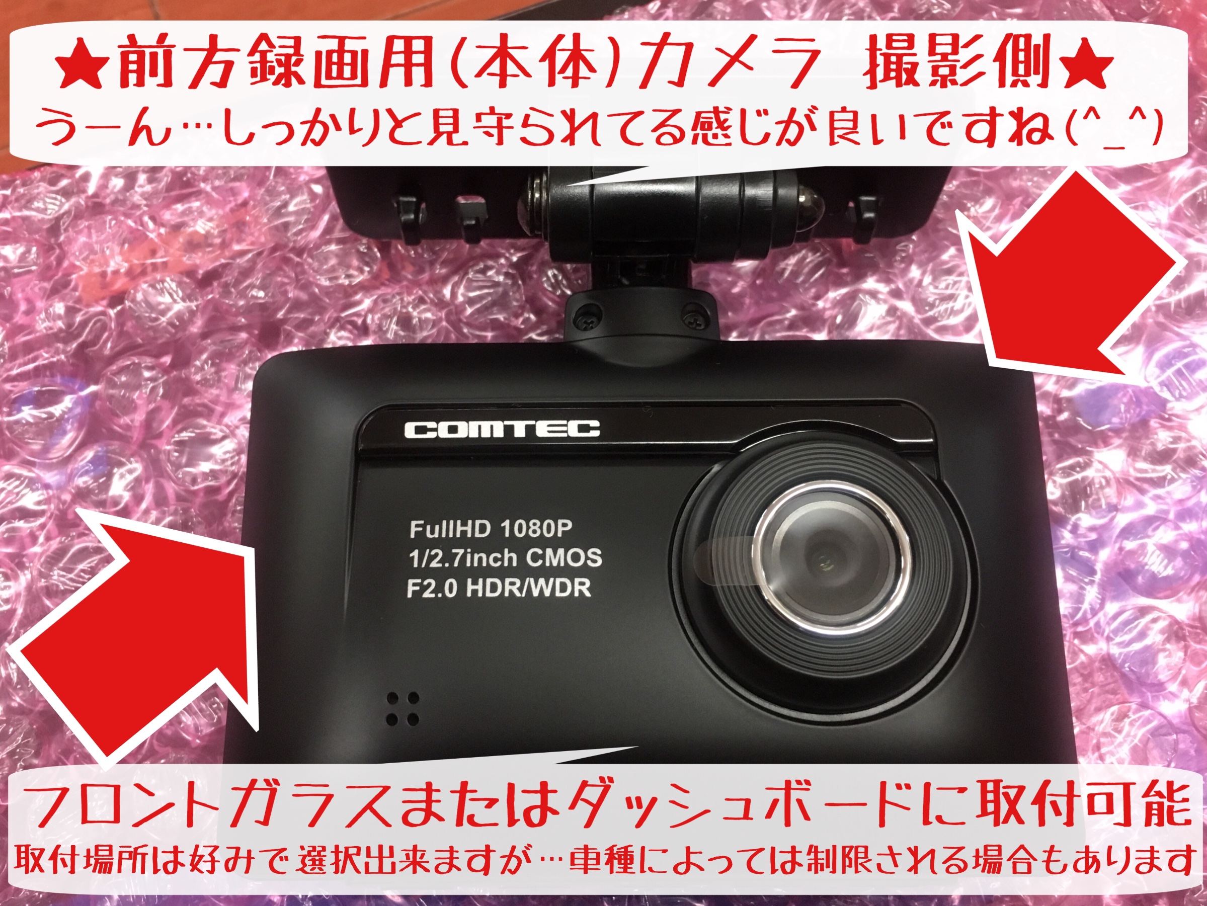 商品特徴:◼️駐車監視機能(オプションハーネス必要) ◼️200万画素前後2カメラ ◼️安全運転支援機能 ◼️高画質でナンバーまでくっきり! ◼️WDR/HDR搭載で白飛びなし ◼️ノイズ対策済み◼️全国のLED信号に対応など(コムテックさんのホームページ参照)
