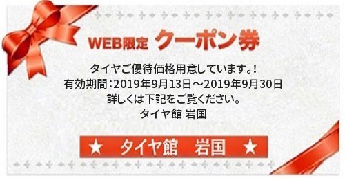 ★こちらのクーポン券をお持ちの方、または、携帯電話の画面をご提示くださった方・・・ご優待価格用意しています(ファイアストン/デイトンタイヤやセール品・限定品除く)。★タイヤ館岩国店のみ有効です。