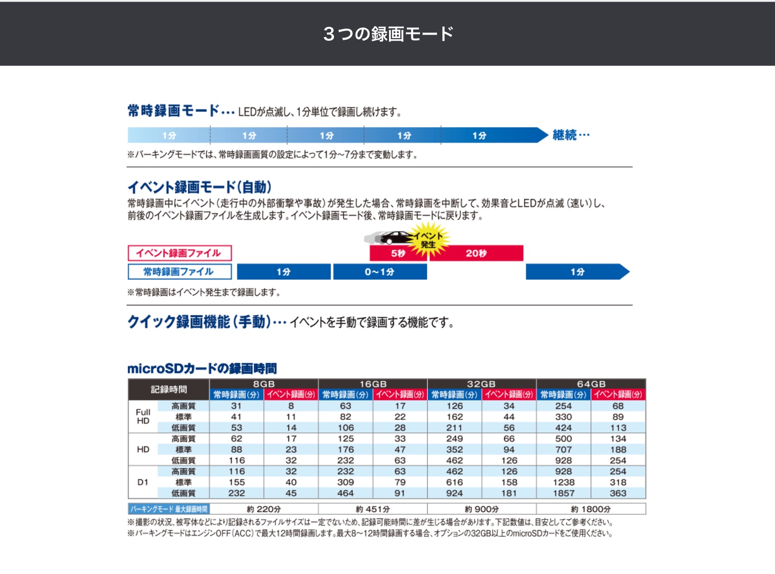 - ※録画画質設定の変更や、microSDカードの状態によっては、フォーマットが必要となります。