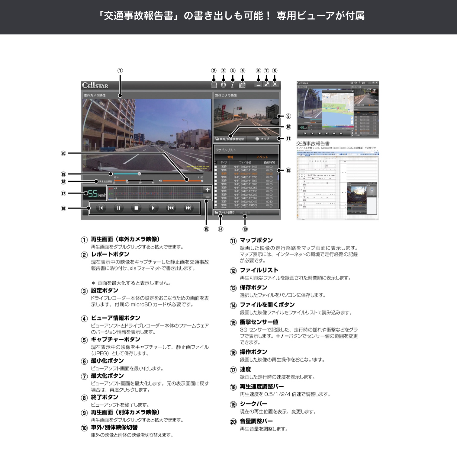 記録データにGPS情報が付加されるので日時情報、インターネット地図連動(走行軌跡)、Gセンサーによる振動情報を表示できます。また、「交通事故報告書(XLSファイル)」の書き出しも可能です。
