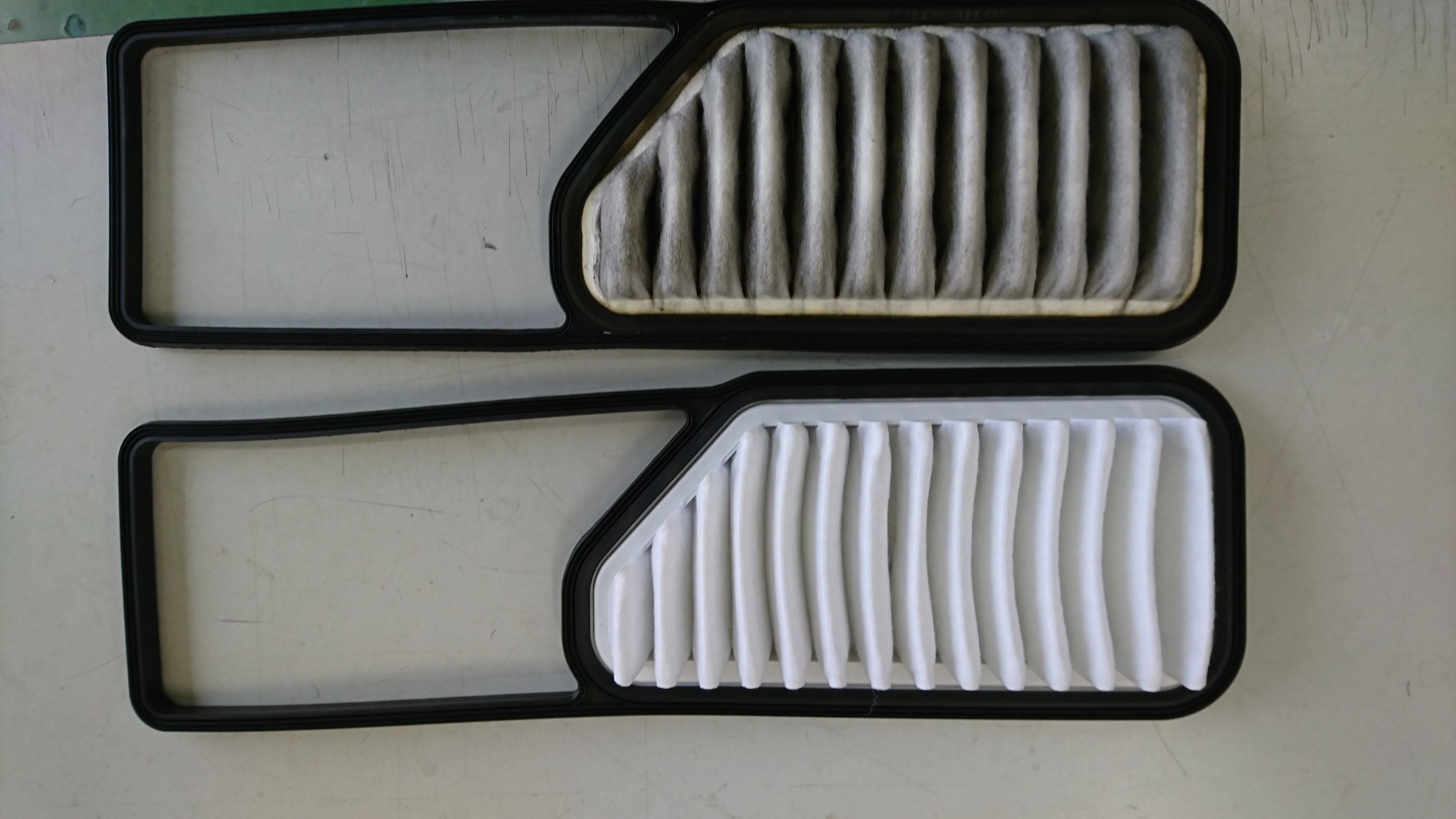 交換部品はエンジンルーム内のエアフィルター(上が交換前、下が新品)