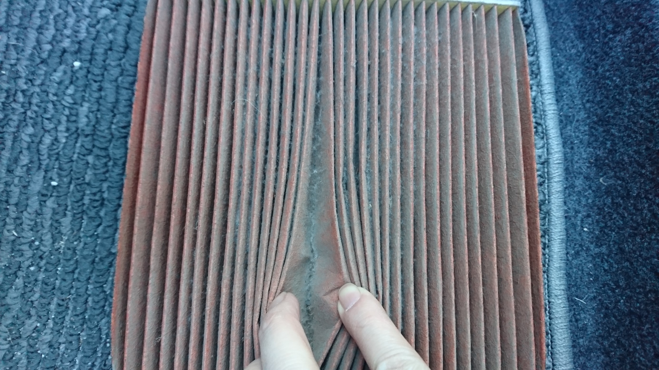 そしてホコリまみれのエアコンフィルターの交換前。