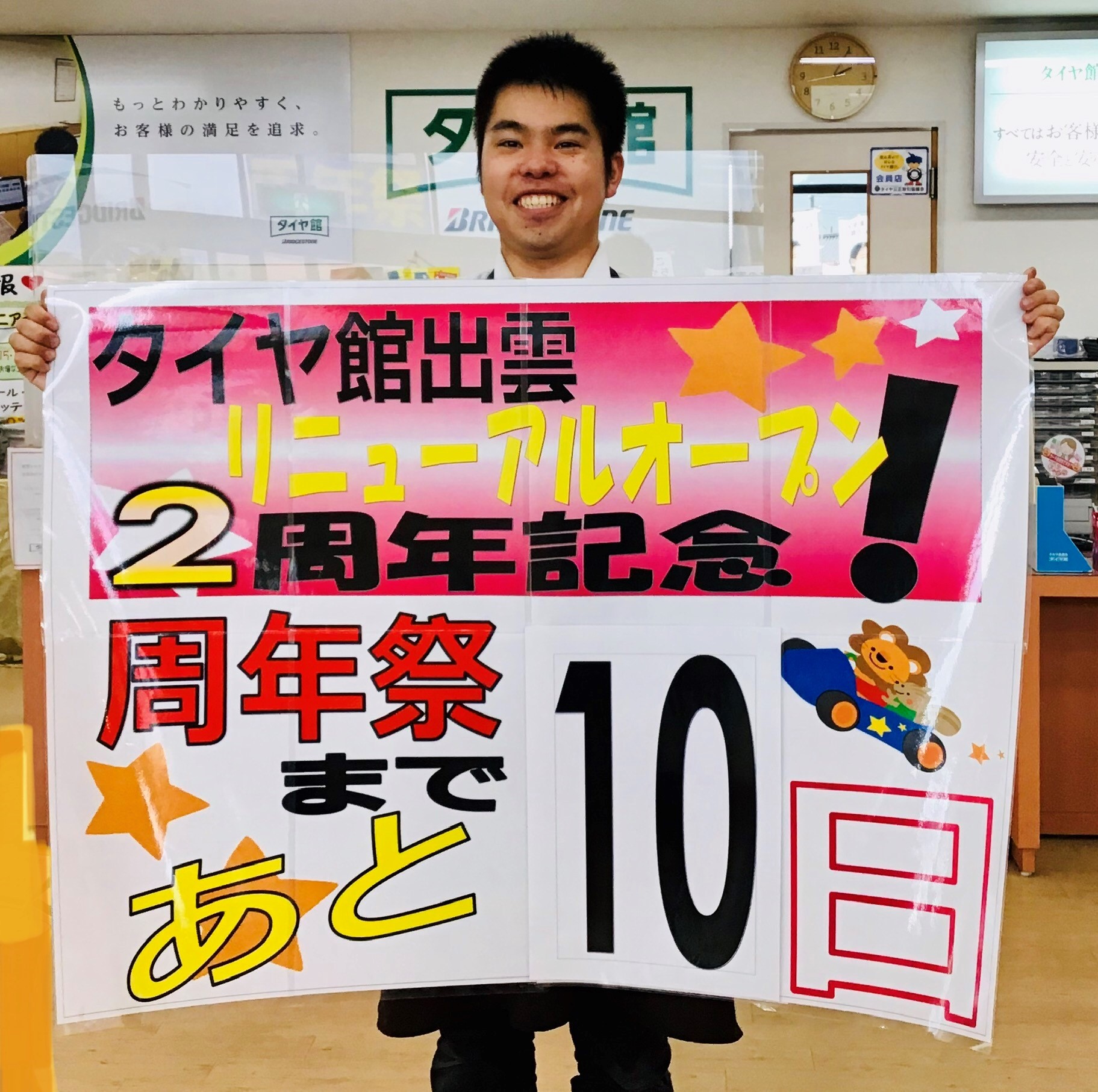 周年祭まであと10日 ポスト 2020年9月15日 こんにちは、タイヤ館出雲店です。 暑さもだいぶ和らいできて涼しくなってきましたね。 今月の25,26,27日開催の周年祭に向けて、全スタッフ着々と準備を進めております。 皆様のご来店心よりお待ちしております。 担当:野津