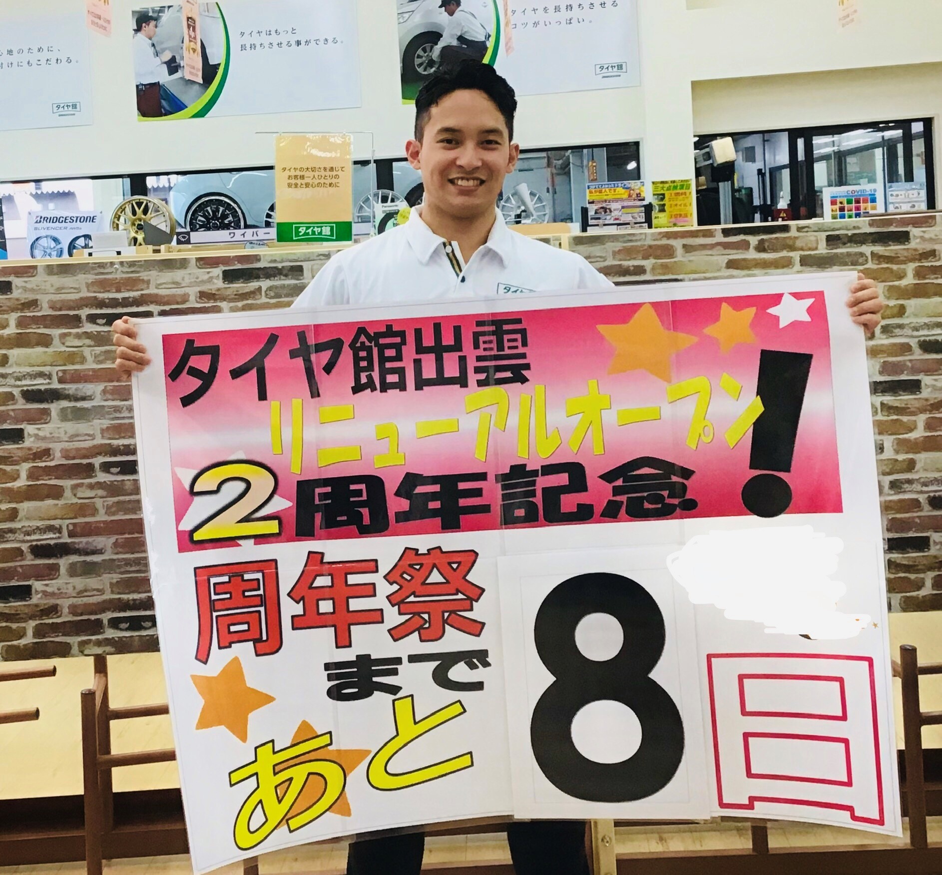 周年祭まで!! ポスト 2020年9月17日 こんにちは!タイヤ館出雲店の小川です。周年祭まであと8日!!ちゃくちゃくと準備をしています(*^^*)ご来店いただく皆様に感動してもらえるようかんばります!(^^)!タイヤの見積から車高調、ドライブレコーダー取付、なんでも見積りさせていただきますので、ぜひ!...ご来店心よりお待ちしております。