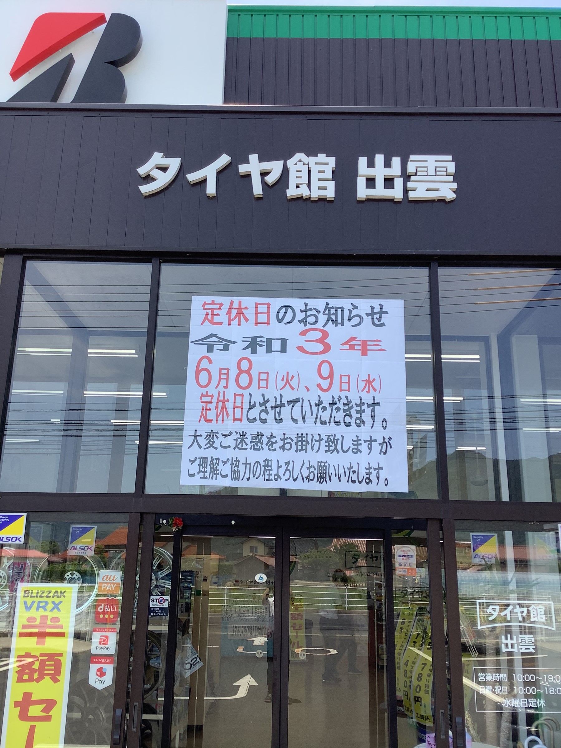 定休日のお知らせ ポスト 2021年6月7日 こんにちは、タイヤ館出雲店です。 6月8日、9日を定休日とさせていただきます。 大変ご迷惑をお掛け致しますがご理解ご協力の程よろしくお願い致します。 尚、10日より営業となります。