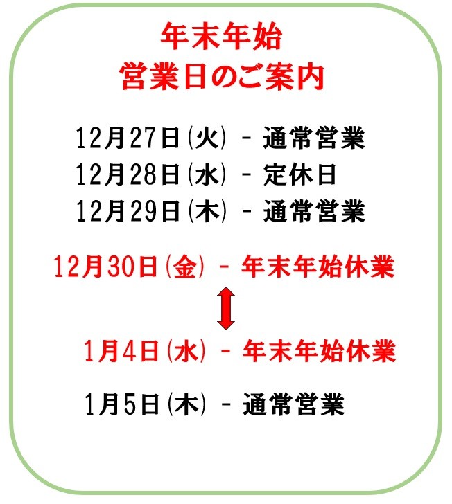 年末年始の営業日のご案内 ポスト 2022年12月23日 いつもご利用いただき有難うございます。 タイヤ館出雲の土谷です。 今年も残りわずかとなってまいりました! 雪も降ってきましたが冬タイヤの履き替えはお済ですか? さて今回は年末年始の営業日のご案内になります。 年内の営業日もまだございますのでお気軽にお問合せご利用もお待ちしております。 タイヤ館 出雲 【営業時間】 月~土曜 10:00~19:00 日曜・祝日 10:00~18:00 【定休日】 毎週水曜日 担当:土谷