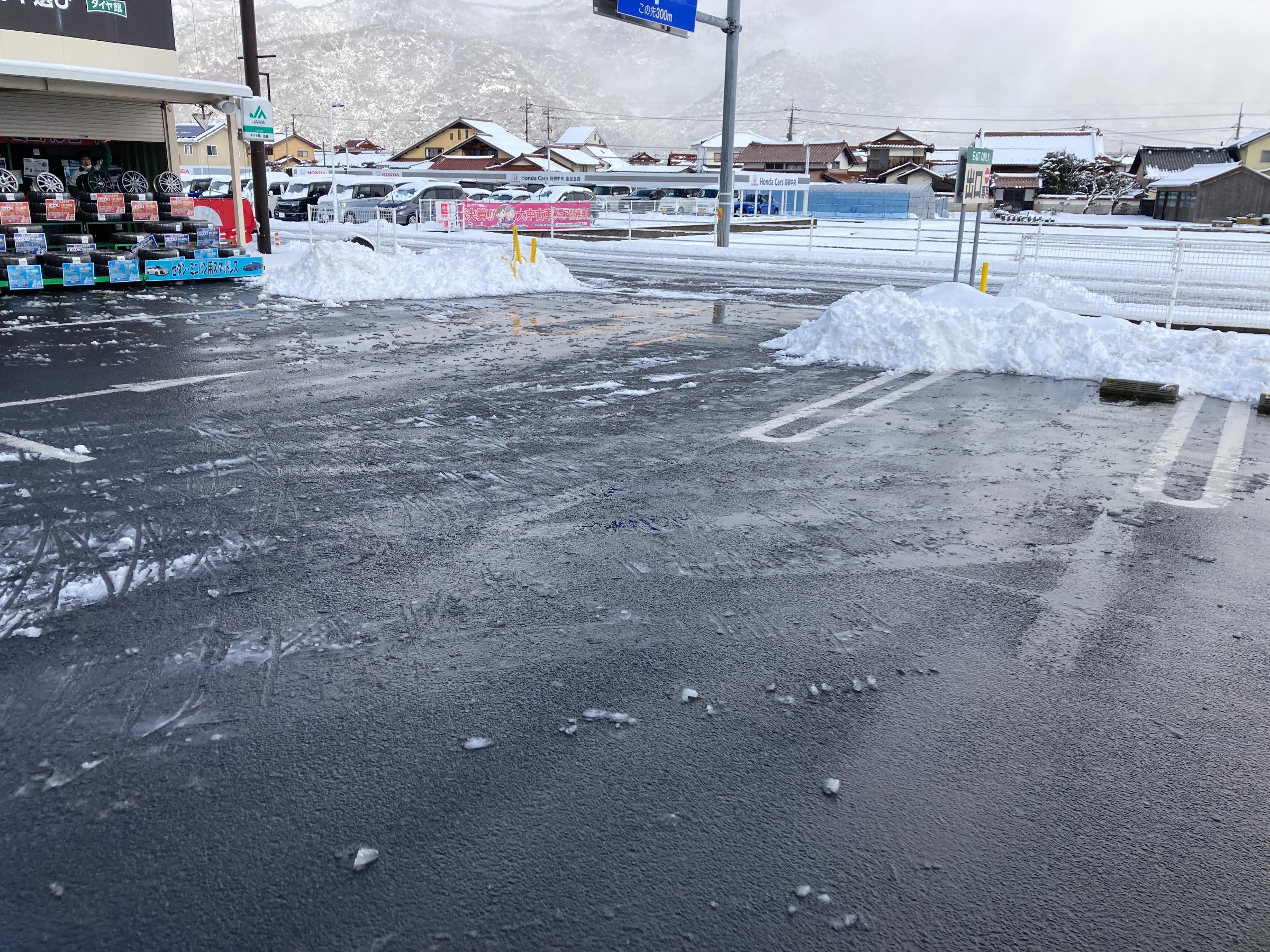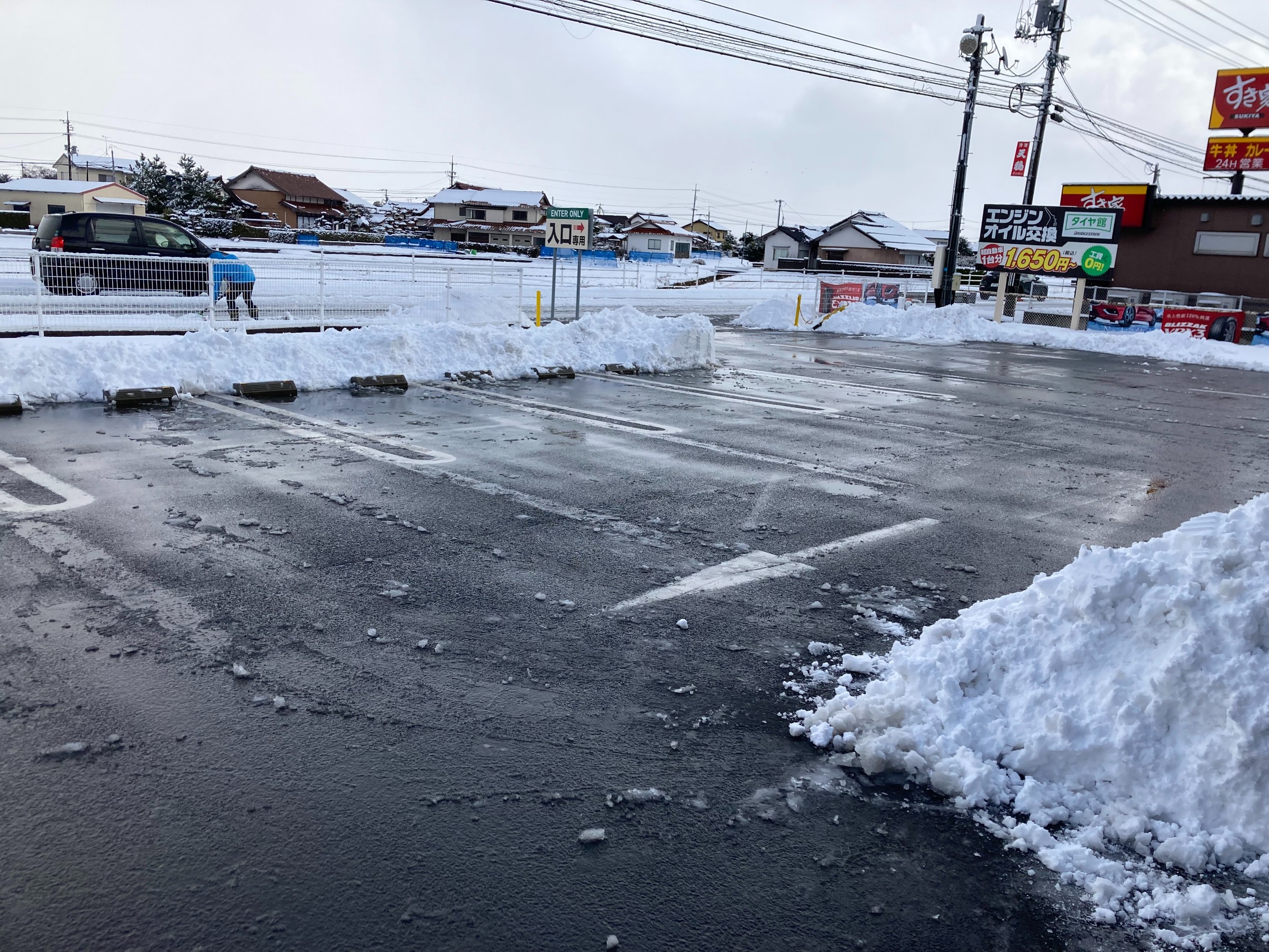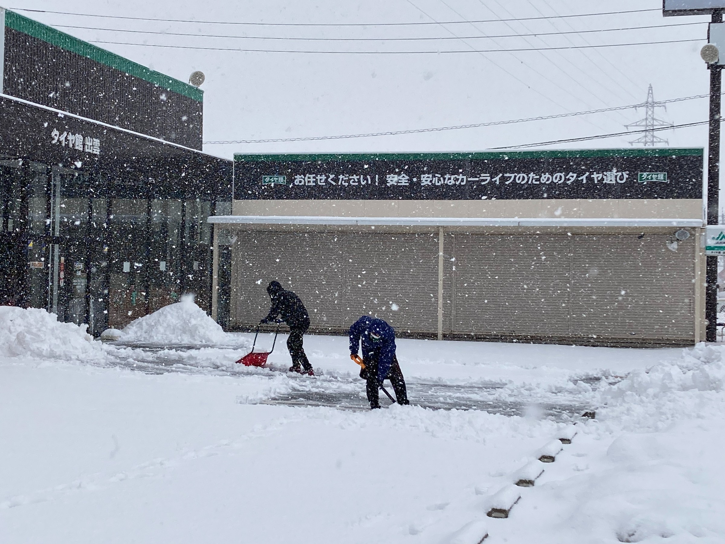 駐車場が真っ白になったので、スタッフで雪かきをしました。