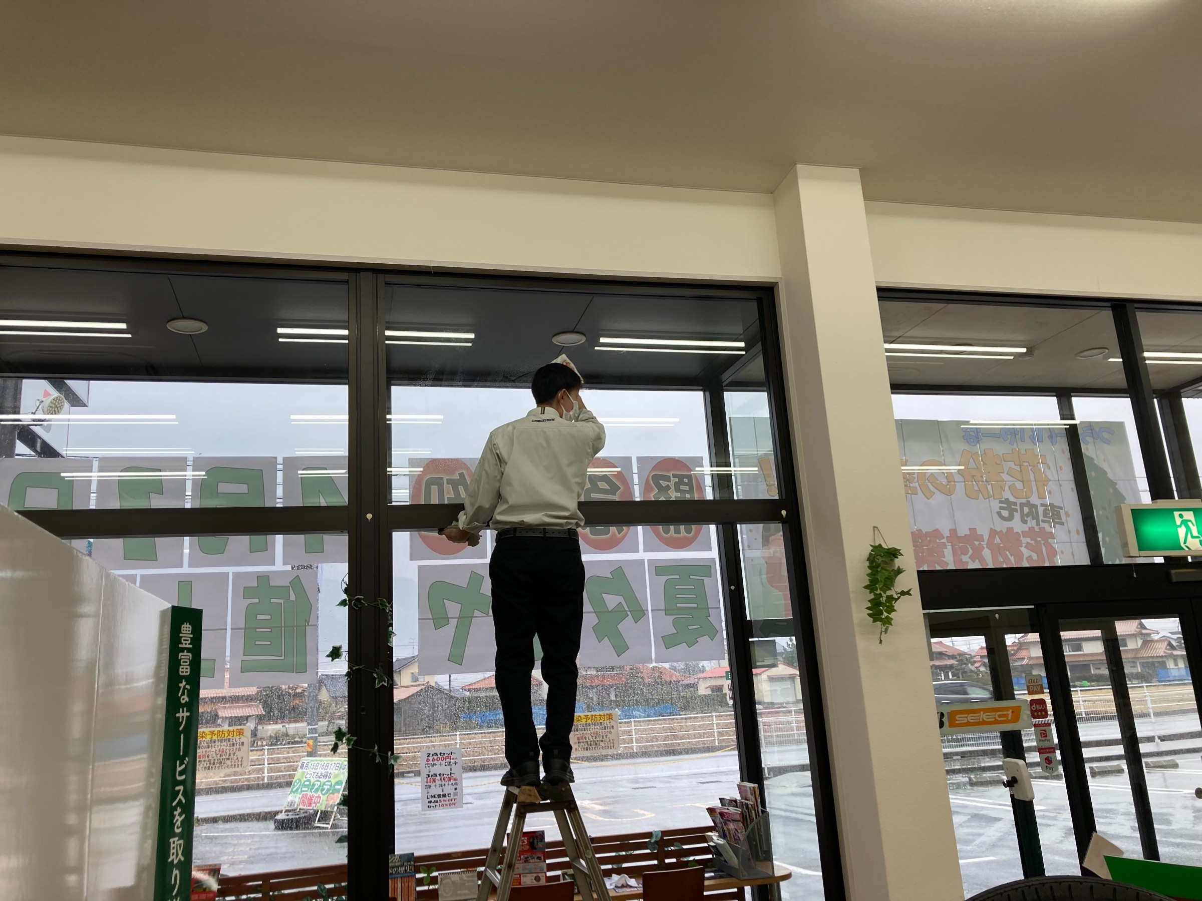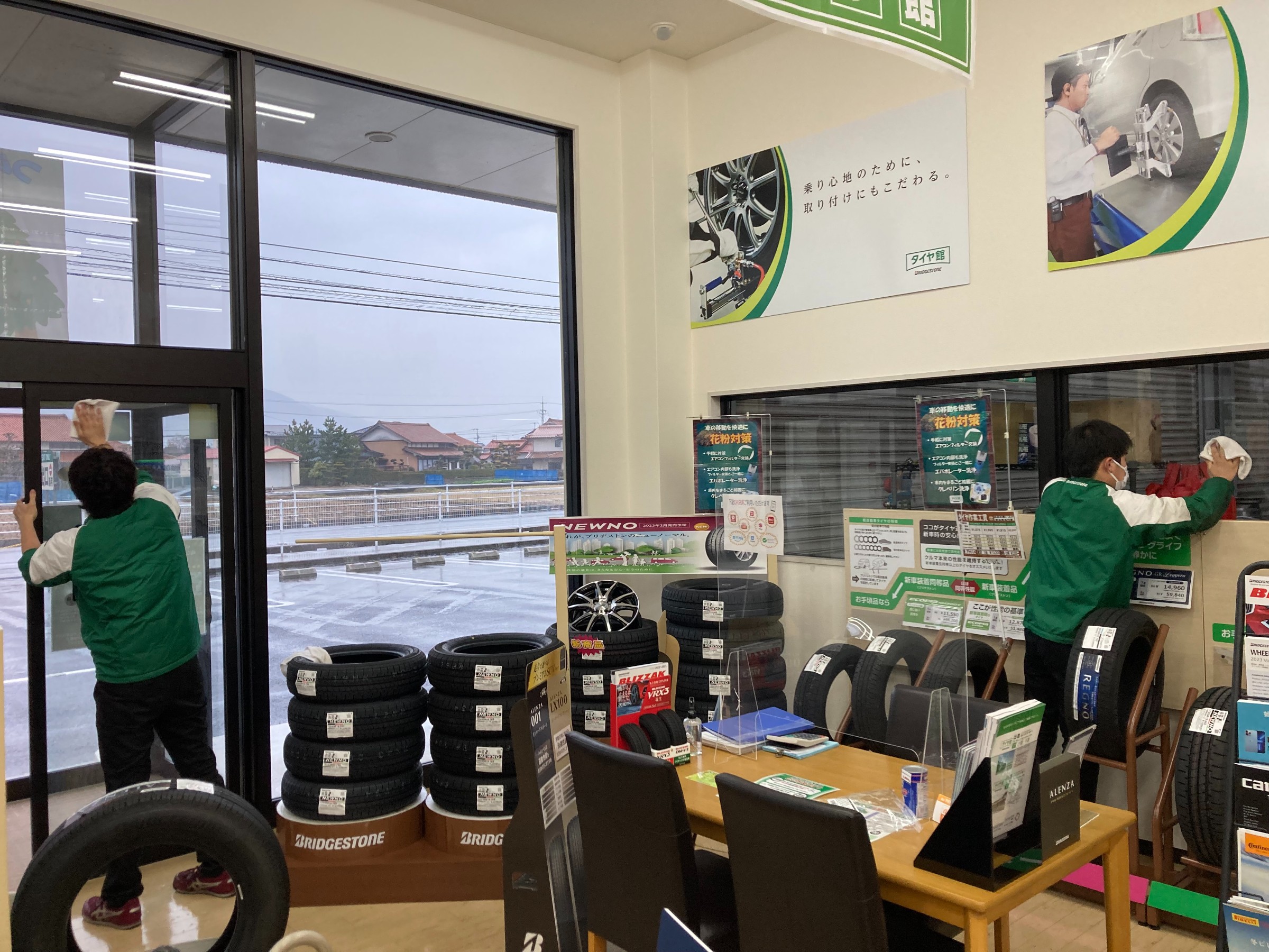 店内も春仕様にしましたので、店内の窓をスタッフで掃除しました!