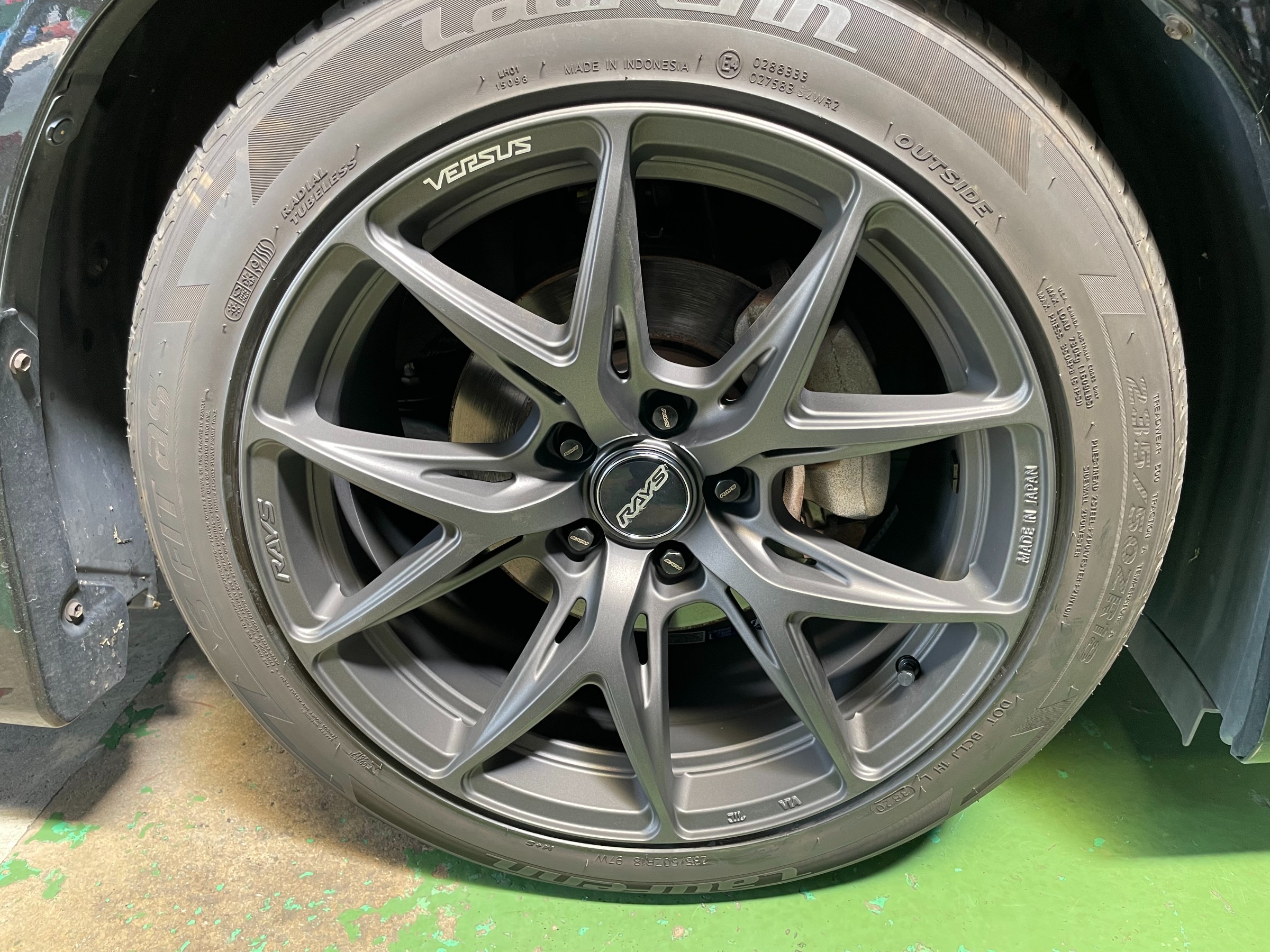 ホイールはいろいろ悩まれましたが、オーナー様ご希望の18インチ、前後通しサイズでツラを出したい、黒系という条件の中で最終的に”RAYS ベルサスVV21S”をオススメさせていただきました!
