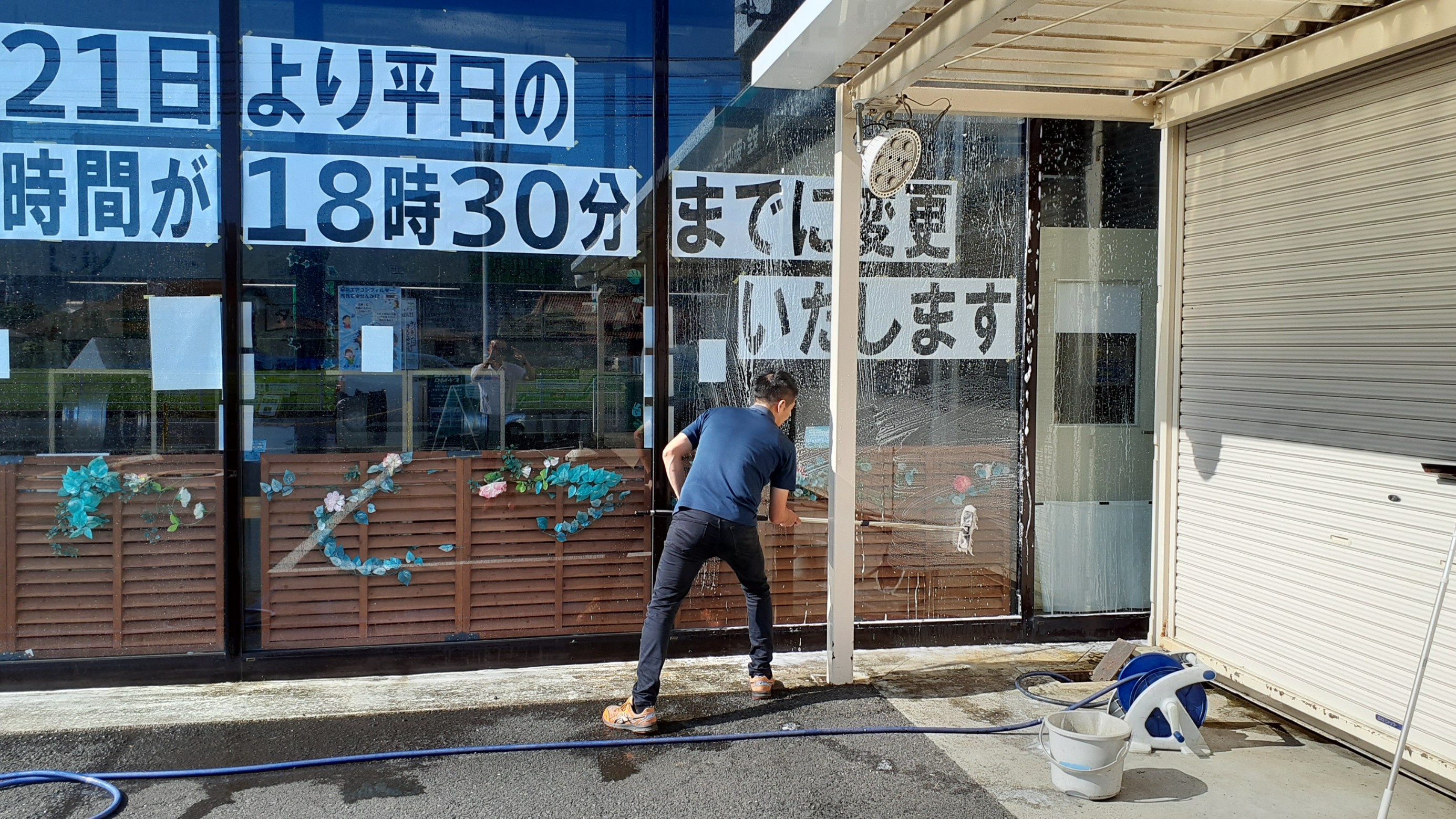 盆明けて早速、店の外の窓、シャッター掃除と草取りをスタッフ総出で行いました。