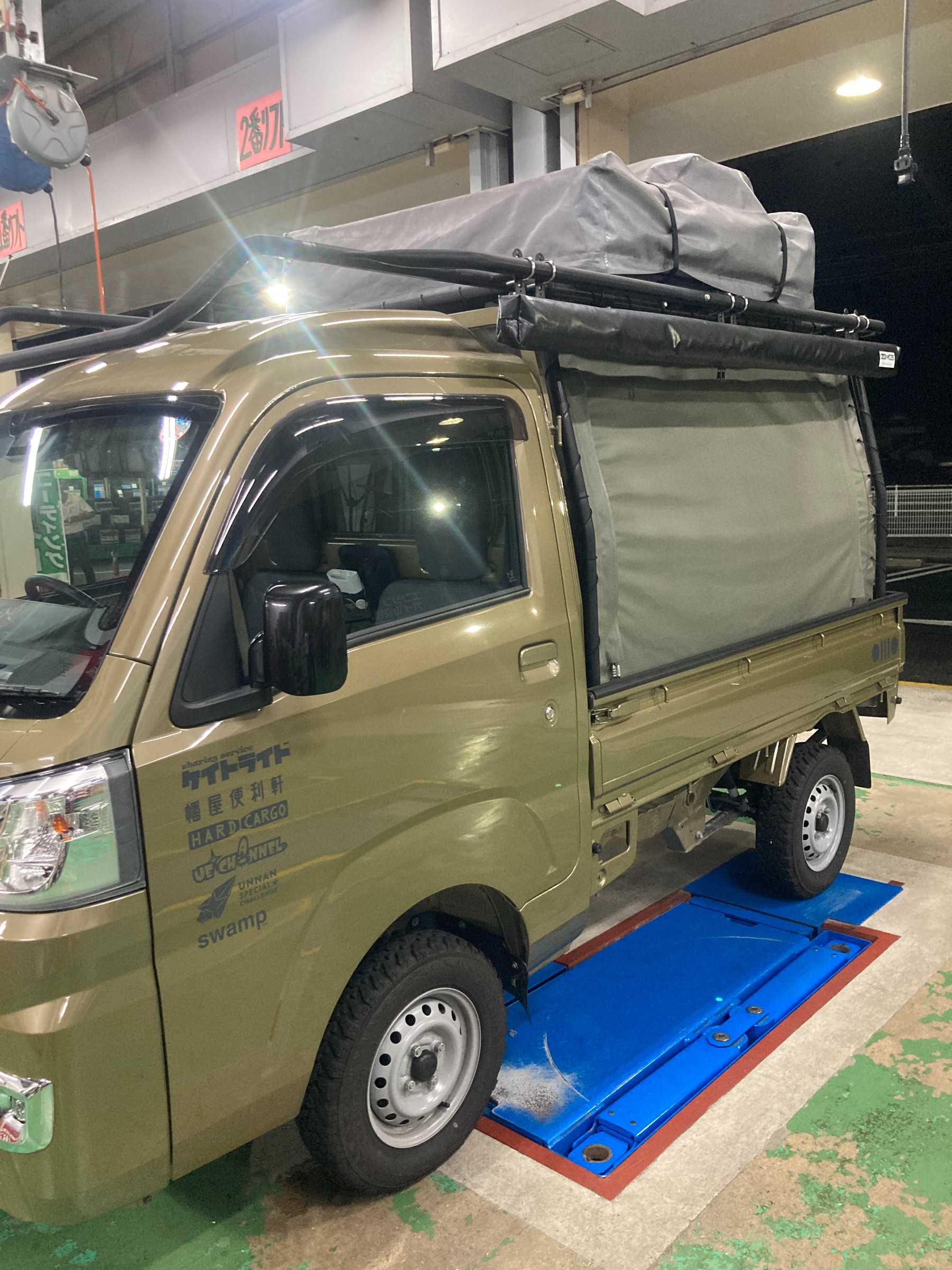 多数の展示ホイールと、ハードカーゴのキャンピングカー。