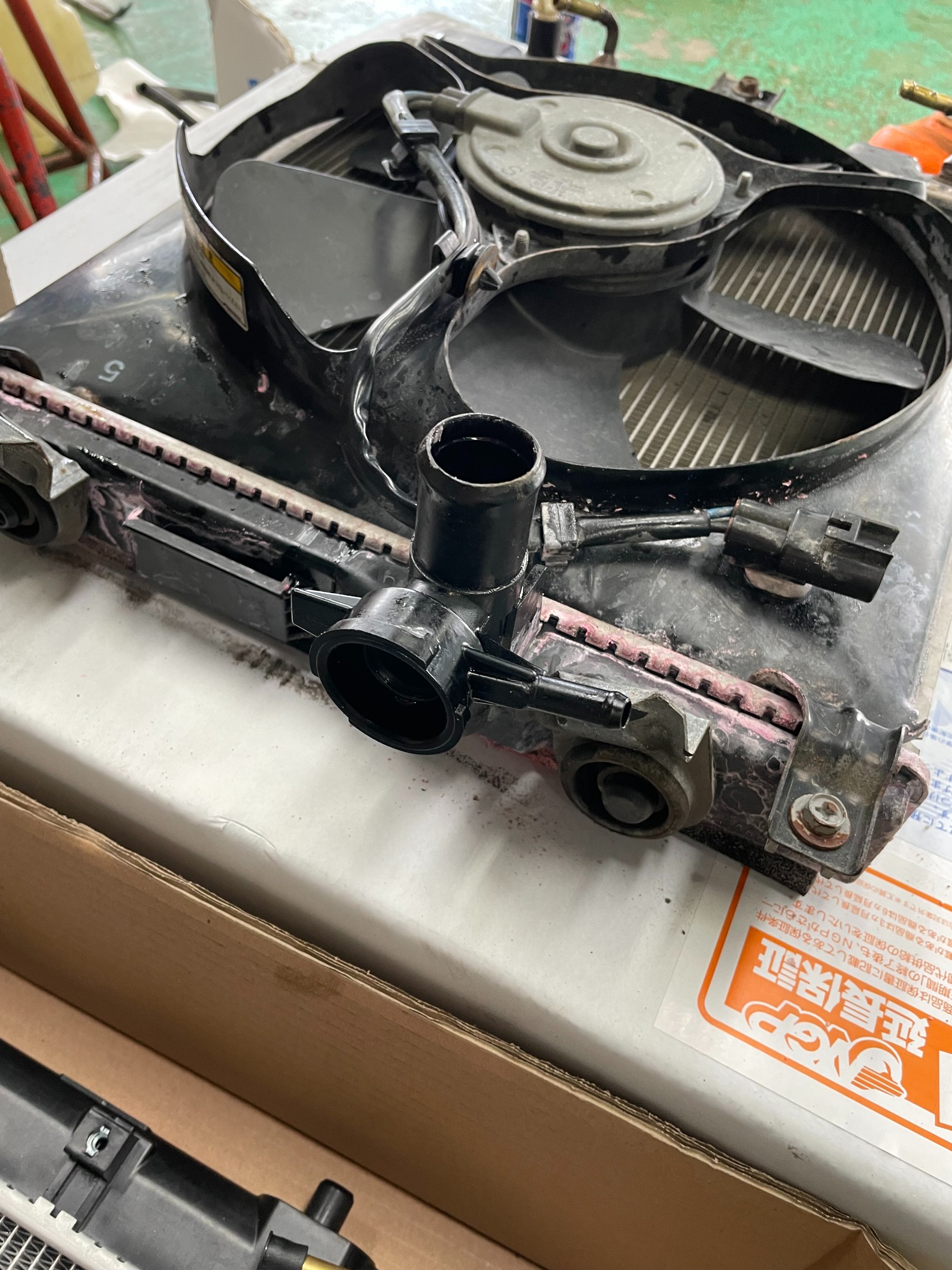エンジンルームを覗くと、ラジエーターから冷却水が漏れています( ゚Д゚)